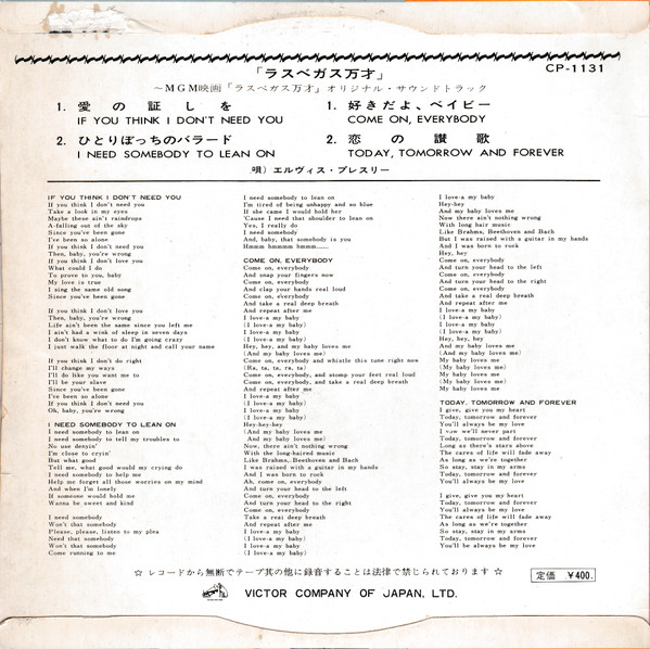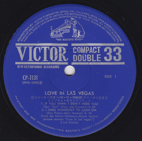 | Label: Victor – CP-1131 Series: Victor Compact Double 33 Format: Vinyl, 7", 33 ⅓ RPM, EP Country: Japan Released: Sept 1964 Manufactured By – Victor Company Of Japan, Ltd. Laminated flipback cover with English lyrics on the back. The English title of the EP, Love In Las Vegas, only appears