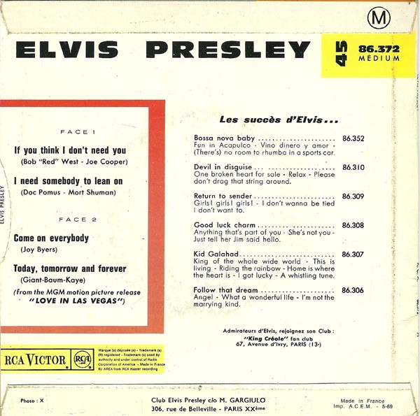 | Label: RCA Victor – 86.372 Format: Vinyl, 7", 45 RPM, EP, Repress, Mono, Orange Labels Country: France Released: 1969 Made By – AREA (2) Rights Society: BIEM |