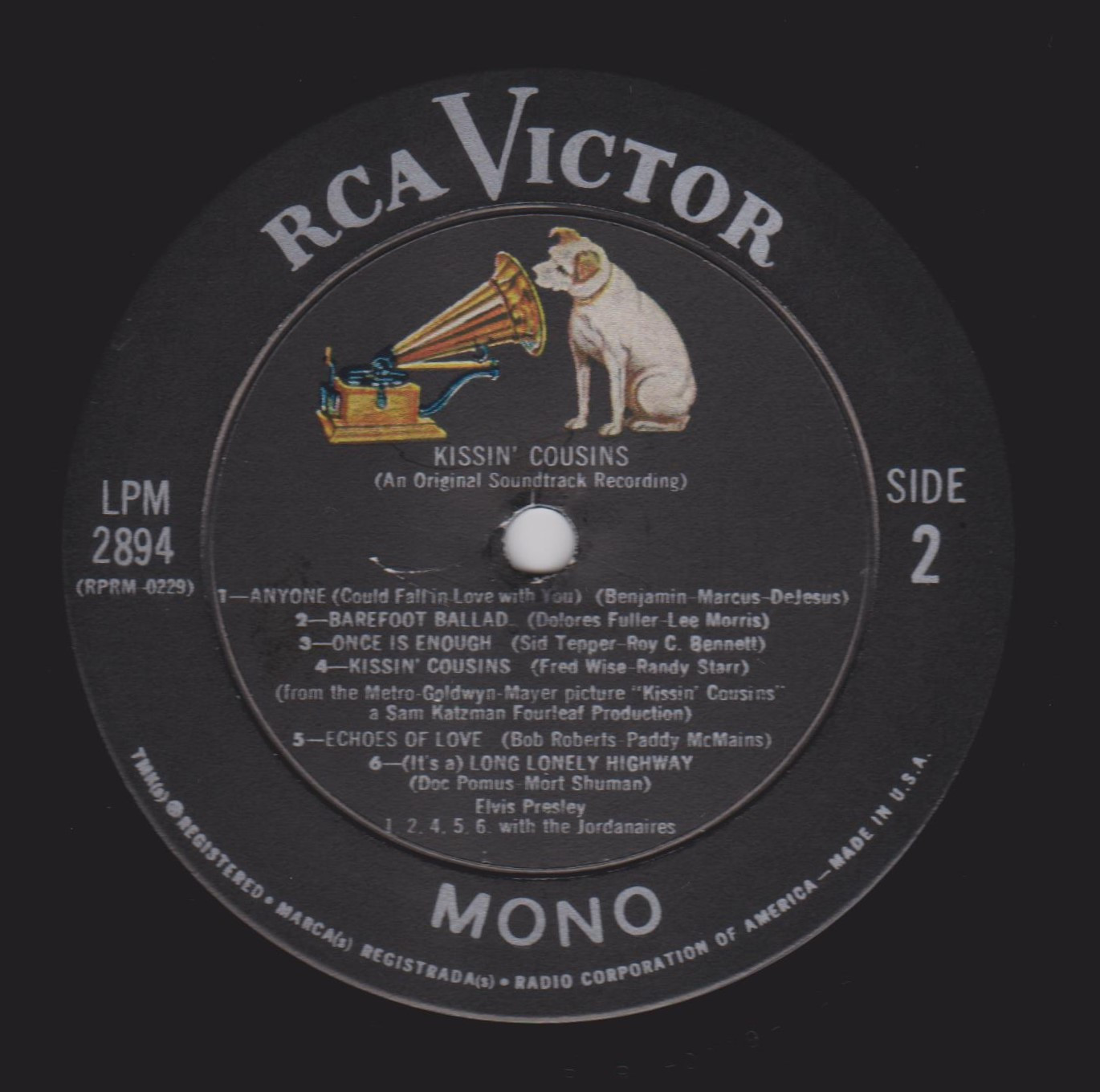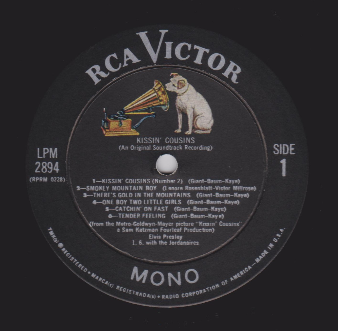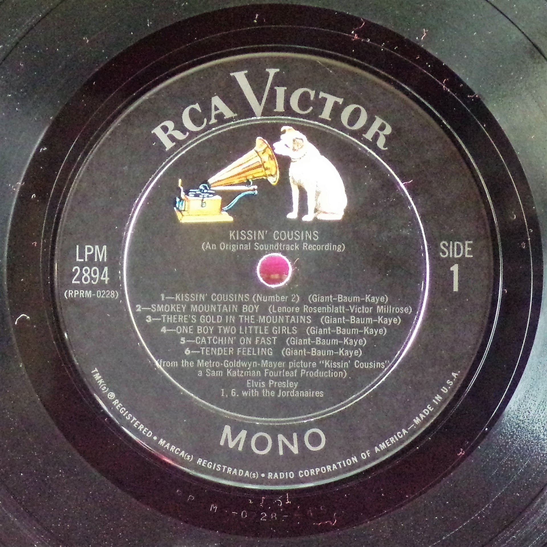 photo beneath. Catalogue number bottom left. Rear Cover : 6 photos of Elvis. Catalogue number top right Mono LPM 2894 / Stereo LSP 2894. Printed in U.S.A. above 3rd photo from left at bottom. Label : Black with silver lettering & dog on top. Side 1 : MONO at bottom. Side 2 : MONO at bottom. Pressing Plant : Rockaway Matrix Number Side 1 : RPRM - 0228 - 2S A5 (Machine Stamped) Matrix Number Side 2 : RPRM - 0229 - 2S A2 (Machine Stamped) *NOTE* Front cover has cast photo. Under Kissin Cousins on labels "An Original Soundtrack Recording". Light silver font on labels. |