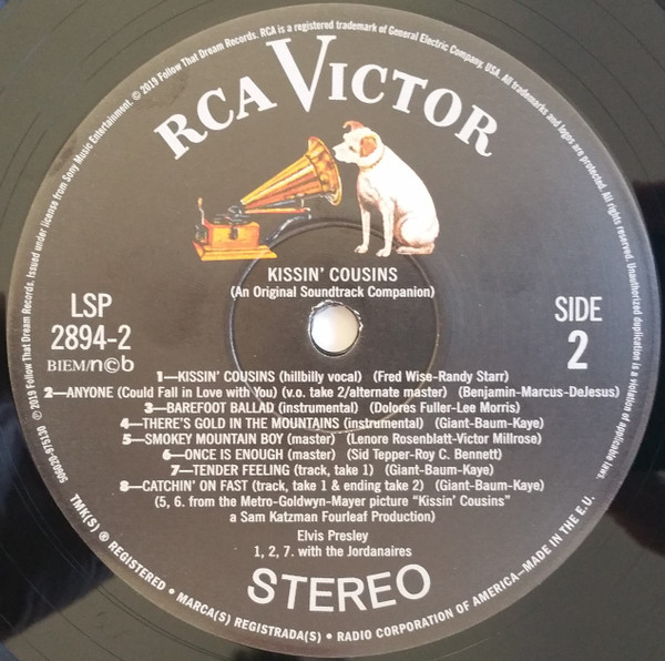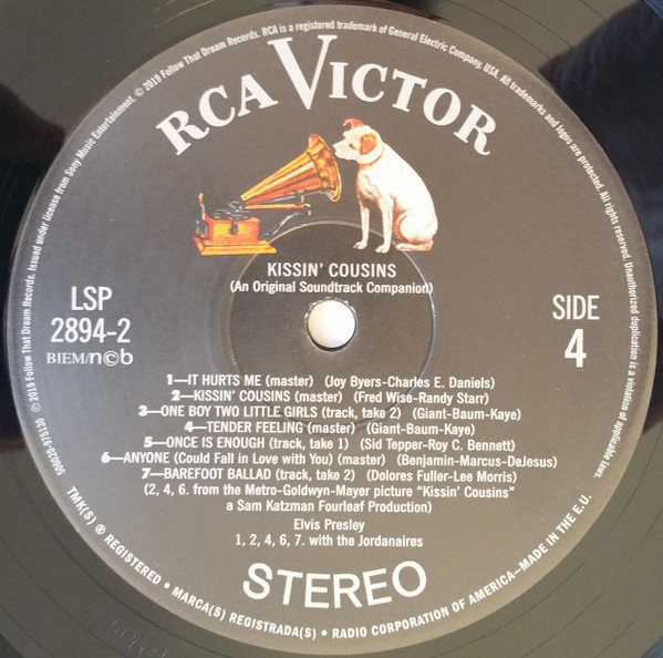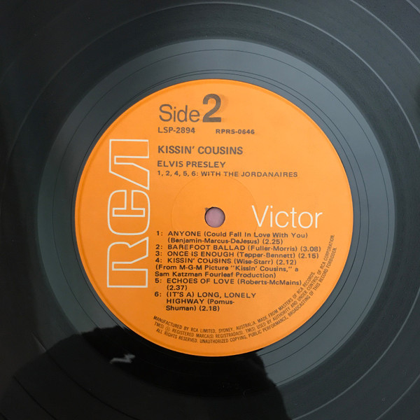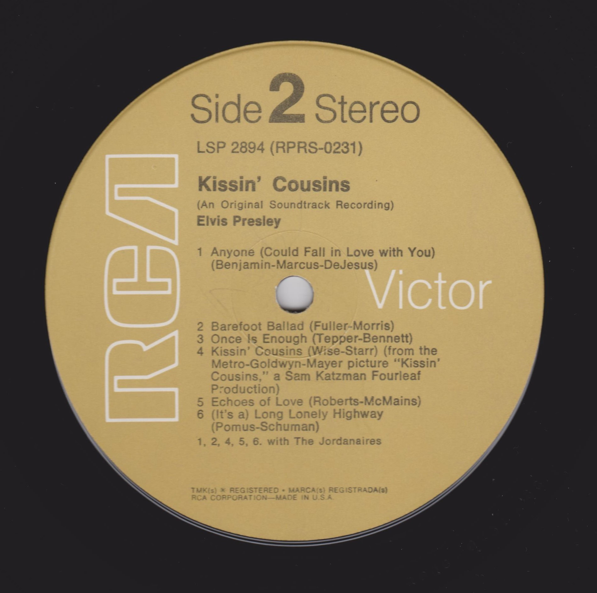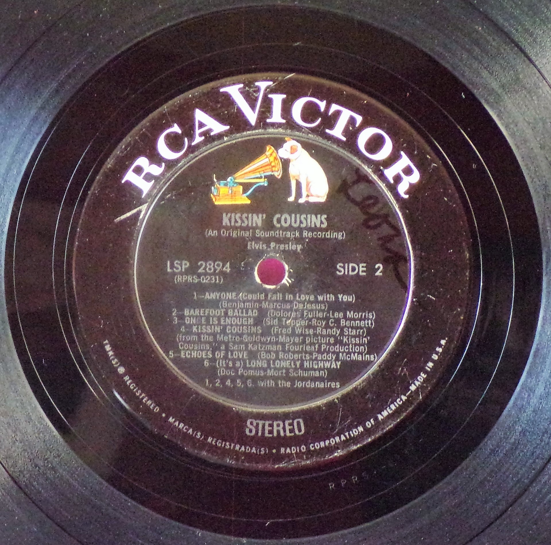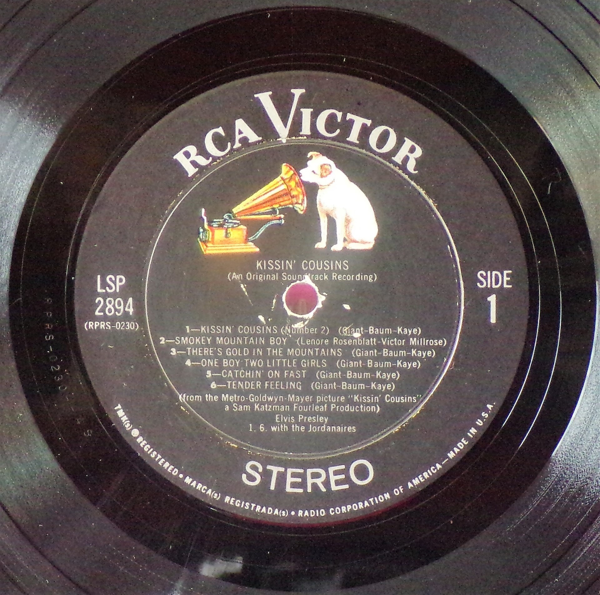 photo beneath. Catalogue number bottom left. Rear Cover : 6 photos of Elvis. Catalogue number top right Mono LPM 2894 / Stereo LSP 2894. Printed in U.S.A. above 3rd photo from left at bottom. Label : Black with silver lettering & dog on top. Side 1 : MONO at bottom. Side 2 : MONO at bottom. Pressing Plant : Rockaway Matrix Number Side 1 : RPRM - 0228 - 2S A5 (Machine Stamped) Matrix Number Side 2 : RPRM - 0229 - 2S A2 (Machine Stamped) *NOTE* Front cover has cast photo. Under Kissin Cousins on labels "An Original Soundtrack Recording". Light silver font on labels. |