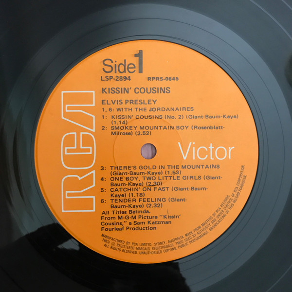 Label: RCA – 447-0644 Series: Gold Standard Series – 447-0644 Format: Vinyl, 7", 45 RPM, Reissue, Label Variation Country: US Released: 1977 Pressed By – RCA Records Pressing Plant, Indianapolis Backing Band [With] – The Jordanaires Slight Label variation to Elvis Presley - Kissin' Cousins Matrix / Runout (Side A Stamped): RPKM 0219 10 |