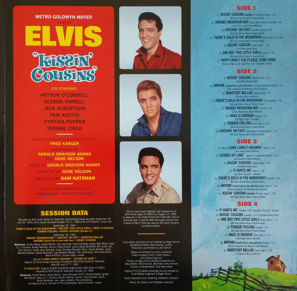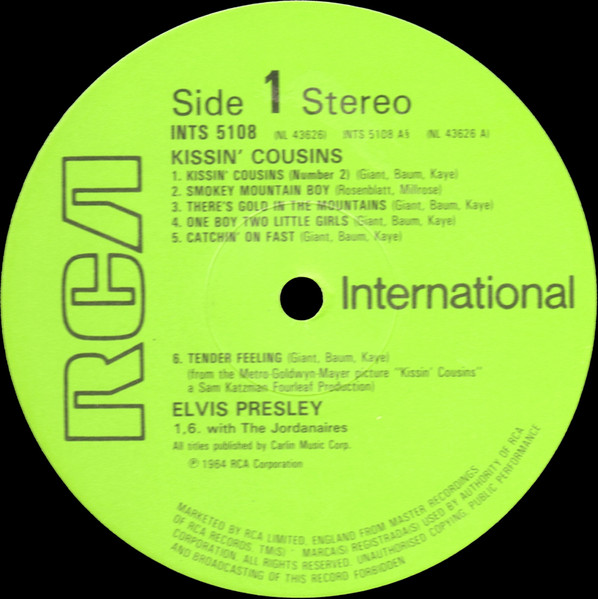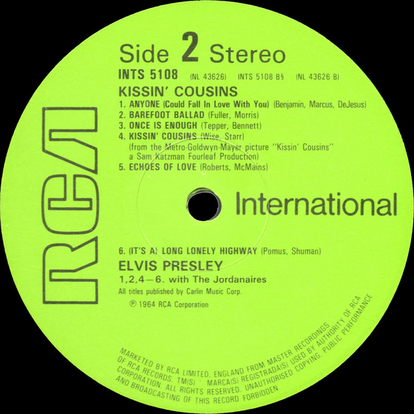 COUSINS (LP) (US) RCA LSP / LPM 2894 Released: April 1964 Side 1 Kissin' Cousins No. 2 *** Smokey Mountain Boy *** There's Gold In The Mountains *** One Boy, Two Little Girls *** Catchin' On Fast *** Tender Feeling *** Side 2 Anyone (Could Fall In Love With You) *** Barefoot Ballad *** Once Is Enough *** Kissin' Cousins 2 Bonus Songs (Not In Movie) Echoes Of Love * Long Lonely Highway ** * Recorded: RCA Studio B, Nashville,