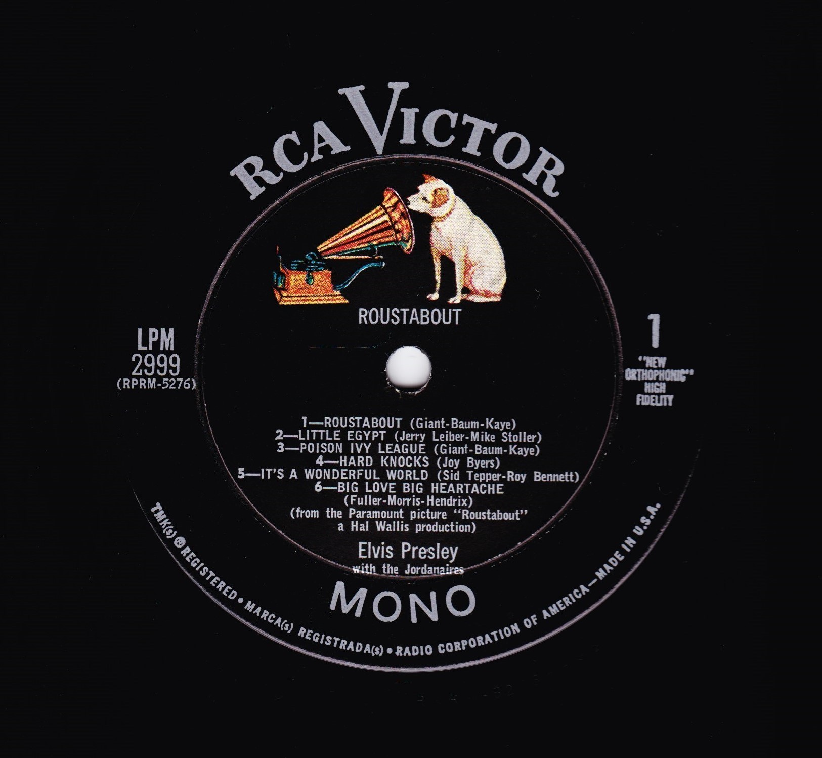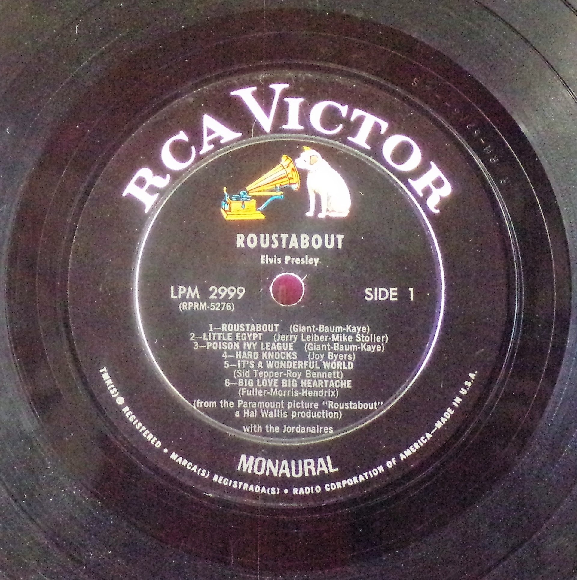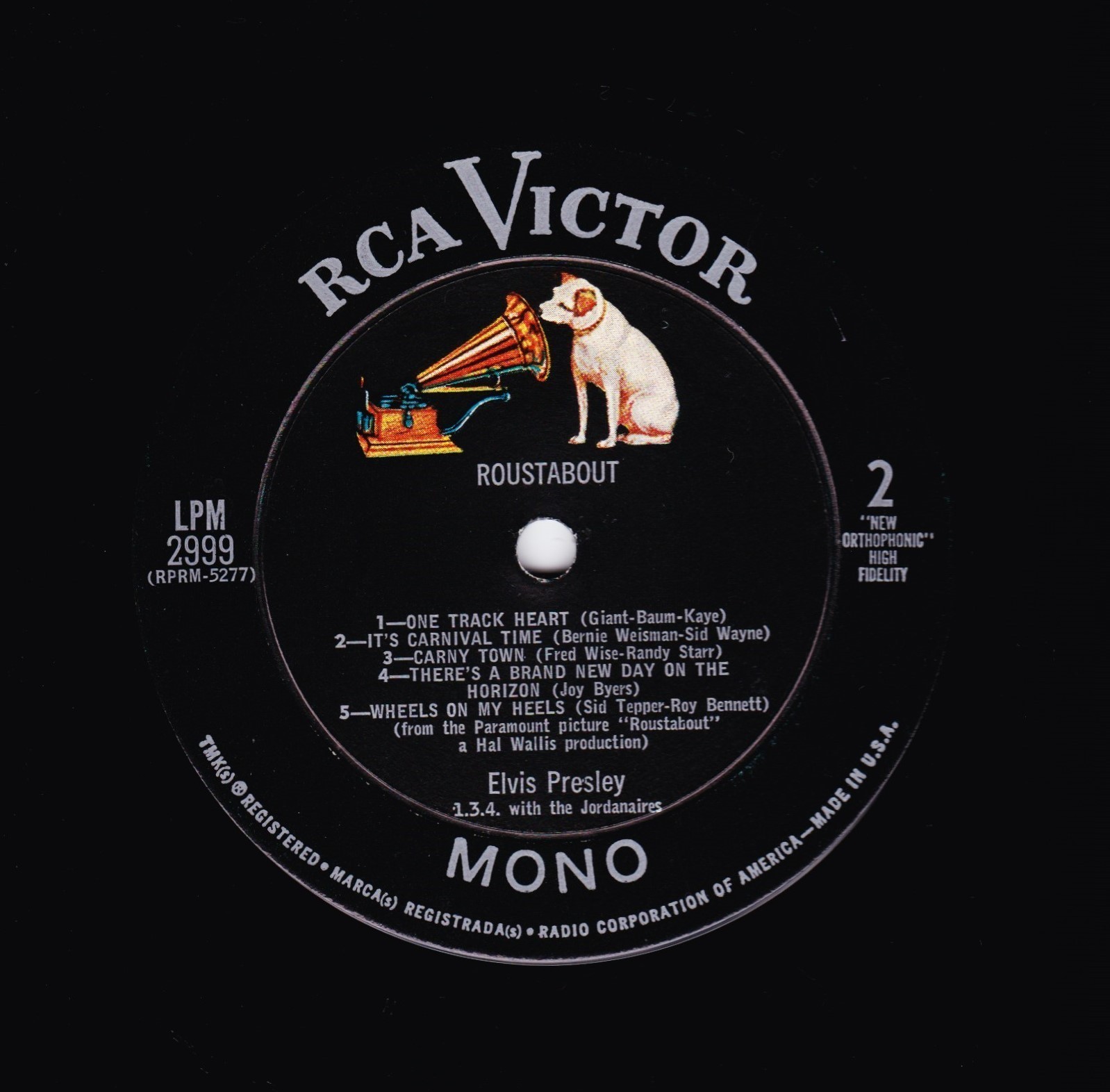 Radio Recorders, Hollywood, March 2, 1964 Brief History : Roustabout is the twenty-first album by Elvis Presley, released on RCA Victor Records in mono and stereo, LPM/LSP 2999, in October 1964. Recording sessions took place at Radio Recorders in Hollywood, California, on March 2 and 3, and April 29, 1964. It peaked at #1 on the Billboard Top Pop Albums chart. It was certified Gold on 5/20/1988 by the R.I.A.A. The album would be Presley's final soundtrack to reach #1 and his last #1 album until 1973's Aloha From Hawaii: Via Satellite. Payments to Presley for each film amounted to between $225,000 to $1,000,000 up front, often half the budget for production, with a 50% share of the profits. These movies were being shot in sometimes as little as three weeks, with the complete scoring and recording of the soundtrack albums taking no more than two weeks. It fell to Colonel Parker's lieutenant Freddy Bienstock to ensure that the soundtrack songs fit into the profit equation with the publishing controlled by Elvis Presley Music or Gladys Music, the Hill and Range Publishing companies owned by Elvis and the Colonel. As a result, successful writers such as Doc Pomus and Mort Shuman, Otis Blackwell and Winfield Scott, and Don Robertson lost interest in adhering to the needs of the grind. It was interlocking self-promotion, causing one MGM employee to remark that the movies "didn't need titles. They could be numbered. They would still sell. Blackwell and Scott in fact submitted a candidate for the title track, "I'm A Roustabout" recorded on March 3, only to find it substituted by a song from a different team of writers. This recording was eventually released by RCA on the top-selling 2003 compilation 2nd to None. Presley and his coterie of top session musicians gamely plowed through all of this, and eleven songs were recorded for the twenty-minute soundtrack LP. Details : 1965 RCA Silver Logo on top |