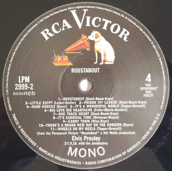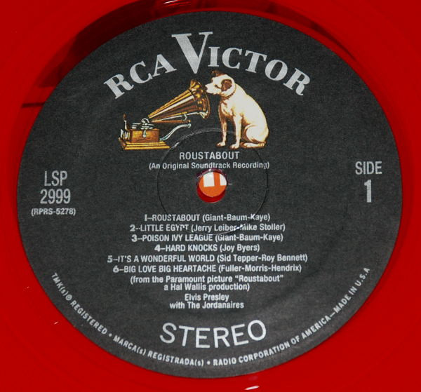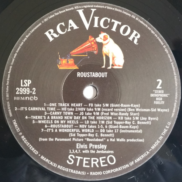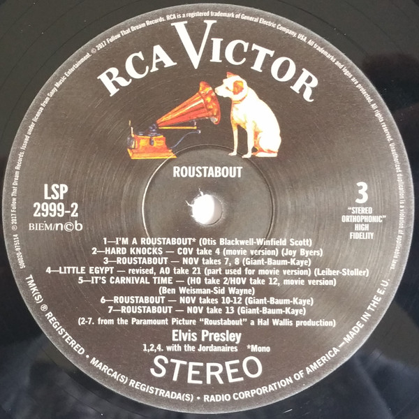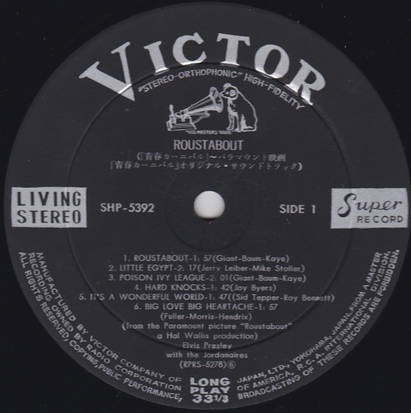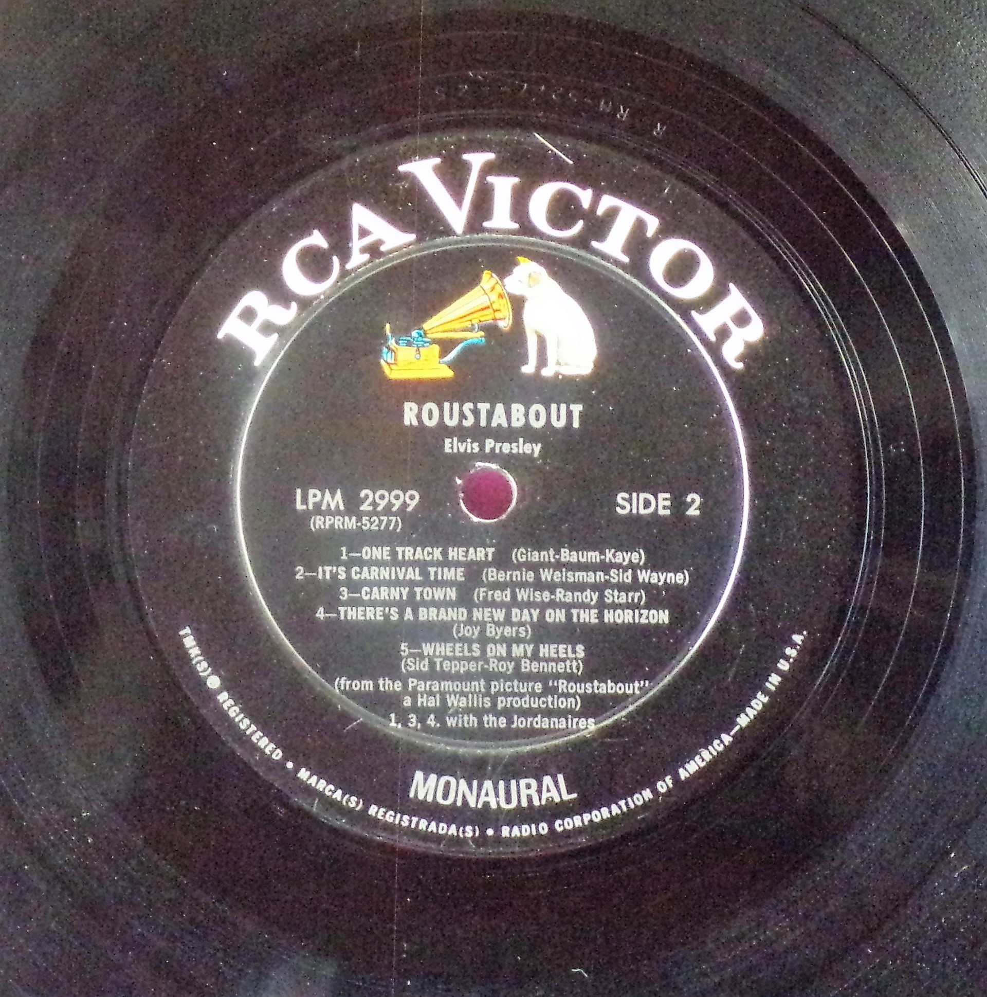 Radio Recorders, Hollywood, March 2, 1964 Brief History : Roustabout is the twenty-first album by Elvis Presley, released on RCA Victor Records in mono and stereo, LPM/LSP 2999, in October 1964. Recording sessions took place at Radio Recorders in Hollywood, California, on March 2 and 3, and April 29, 1964. It peaked at #1 on the Billboard Top Pop Albums chart. It was certified Gold on 5/20/1988 by the R.I.A.A. The album would be Presley's final soundtrack to reach #1 and his last #1 album until 1973's Aloha From Hawaii: Via Satellite. Payments to Presley for each film amounted to between $225,000 to $1,000,000 up front, often half the budget for production, with a 50% share of the profits. These movies were being shot in sometimes as little as three weeks, with the complete scoring and recording of the soundtrack albums taking no more than two weeks. It fell to Colonel Parker's lieutenant Freddy Bienstock to ensure that the soundtrack songs fit into the profit equation with the publishing controlled by Elvis Presley Music or Gladys Music, the Hill and Range Publishing companies owned by Elvis and the Colonel. As a result, successful writers such as Doc Pomus and Mort Shuman, Otis Blackwell and Winfield Scott, and Don Robertson lost interest in adhering to the needs of the grind. It was interlocking self-promotion, causing one MGM employee to remark that the movies "didn't need titles. They could be numbered. They would still sell. Blackwell and Scott in fact submitted a candidate for the title track, "I'm A Roustabout" recorded on March 3, only to find it substituted by a song from a different team of writers. This recording was eventually released by RCA on the top-selling 2003 compilation 2nd to None. Presley and his coterie of top session musicians gamely plowed through all of this, and eleven songs were recorded for the twenty-minute soundtrack LP. Details : 1965 RCA Silver Logo on top |