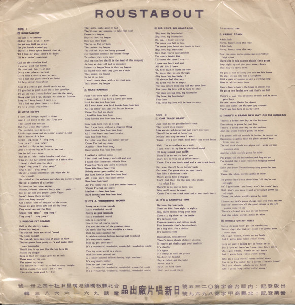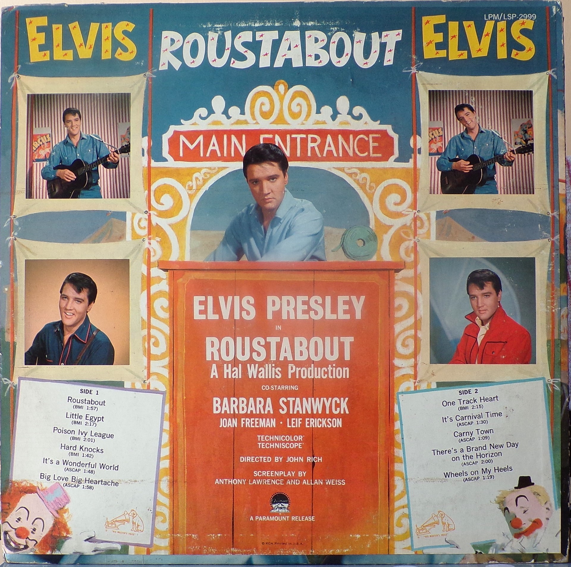 (LP) (US) RCA LSP / LPM 2999 Released: September 21, 1964 Side 1 Roustabout **** Little Egypt * Poison Ivy League * Hard Knocks * It's A Wonderful World * Big Love, Big Heartache ** Side 2 One Track Heart ** It's Carnival Time *** Carny Town ** There's A Brand New Day On The Horizon ** Wheels On My Heels ** * Recorded: