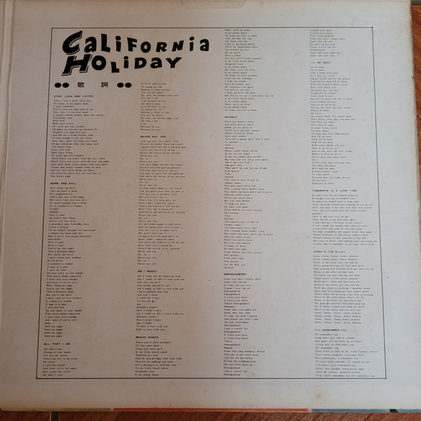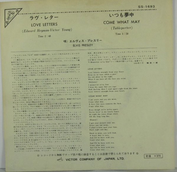 | Label: RCA – RPL-2021 Series: エルヴィス・オン・スクリーン1800 Format: Vinyl, LP, Album, Reissue, Stereo Country: Japan Released: Aug 1982 Phonographic Copyright ℗ – RCA Records Previously released in Japan in 1966 and 1969. This version was released with obi and insert containing English lyrics and Japanese liner notes. Matrix / Runout (Runout Side A - Stamped): RPL-2021A 121 Track 3, Side 2 misspelled track "Shout it out", listed as "Shot it out" |