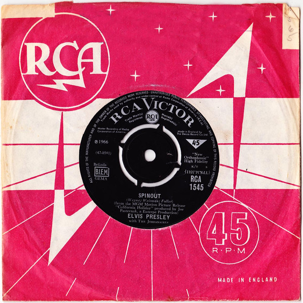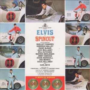 Recorded: Radio Recorders, Hollywood, February 16, 1966 Brief History : Spinout is the twenty-seventh album by Elvis Presley, released on RCA Victor Records in mono and stereo, LPM/LSP 3702, in October 1966. Recording sessions took place at Radio Recorders in Hollywood, California, on February 16 and 17, 1966. It peaked at #18 on the Top Pop Albums chart. In early 1966, executives at RCA and the Colonel had arrived at the same conclusion. They could no longer expect records of only soundtrack recordings and session leftovers to perform as strongly as in the past. Popular music was rife with changes in the mid-1960s, and with chart dominance from The Beatles, Bob Dylan, and a host of others, Presley no longer reigned supreme in the marketplace. Soundtrack sales were plunging, shifting fewer units and peaking at lower positions on the chart. But the Spinout sessions still adhered to the same formula of the past four years. Nine songs were recorded for the soundtrack, all of which appeared in the film. The songs derived from the standard pool of songwriters, their publishing rights signed over to Elvis Presley Music and Gladys Music, the companies owned by Elvis and the Colonel. One song "Stop, Look, and Listen" had been a recent b-side for Bill Haley & His Comets in February 1965. Two songs were released as a single the month before the film's premiere, the title track backed with "All That I Am," and although both sides charted independently the A-side just barely made the Top 40. Elvis performed the song "Adam and Evil" on stage in the film which features a long drum roll at the beginning. He makes reference to Adam and Eve in the Bible, that "Adam and Evil they go hand in hand / Eve taught him sin, that's the way it all began". Elvis clicks his fingers throughout the track. Acknowledging shifts in taste, three additional tracks of a contemporary nature were added as a "special bonus" to bring the album up to a more acceptable running time. Recorded at RCA Studio B in Nashville, Tennessee during the sessions for his gospel album How Great Thou Art, two were rhythm and blues songs. The other was an original by Bob Dylan (publishing rights were, of course, not signed over to Presley and Parker), with a ballad from a later Nashville session in June. "Down in the Alley' had been released in 1957 by The Clovers, and Presley knew of and appreciated the Dylan song from the version on Odetta Sings Dylan by the folk singer Odetta. "I'll Remember You" had been a record by Don Ho, and reflected Presley's infatuation with Hawaii and its culture. Even with these inclusions, the album fared little better than its predecessors in 1966. Dylan confessed to Rolling Stone in June 1969 that Presley's version of "Tomorrow Is A Long Time" was the cover of one of his songs that he "treasured the most." The three additional songs can be found on From Nashville to Memphis: The Essential 60's Masters, while three songs from the film soundtrack appeared on its sister compilation: "Spinout," "All That I Am," and "I'll Be Back." Front Cover : Photo of Elvis. Title to the right. Catalogue number