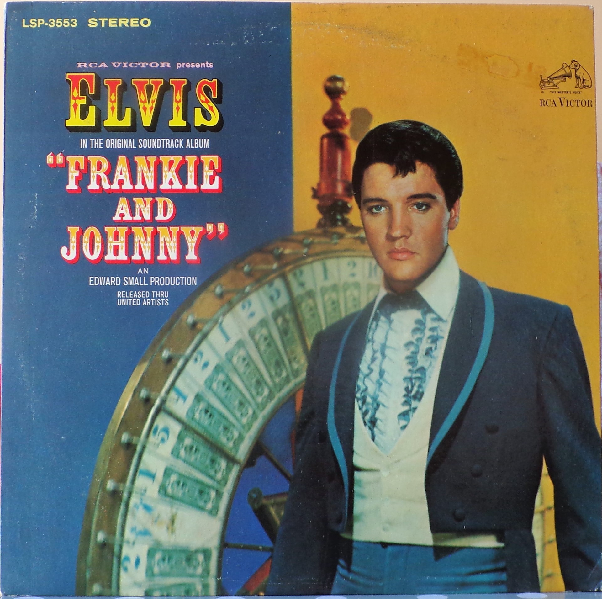 Radio Recorders, Hollywood, May 13, 1965 Brief History : Frankie and Johnny is the twenty-fifth album by Elvis Presley, released on RCA Victor Records in mono and stereo, LPM/LSP 3553, in March 1966. Recording sessions took place at Radio Recorders in Hollywood, California, on May 12, 13, and 14, 1965. It peaked at #20 on the Top Pop Albums chart. It was certified Gold and Platinum on 1/6/2004 by the R.I.A.A. To coincide with the 19th century setting of the film, some traditional song material was utilized for the soundtrack. "When the Saints Go Marching In" is an old gospel hymn that has become a jazz standard associated with the traditional hot jazz of New Orleans. It is paired in a medley with "Down by the Riverside," another traditional gospel song dating back to the relevant time period. Both are in the public domain, and the team of Giant, Baum, and Kaye captured the publishing for Freddy Bienstock and the Colonel. The title song, "Frankie and Johnny," is a variant on the American popular song first published in 1904 and credited to Hughie Cannon. With changed lyrics, another publishing royalty was secured for Gladys Music. Twelve songs were recorded at the sessions for Frankie and Johnny, and all were used and issued on the soundtrack. The title song was issued as a single, with "Please Don't Stop Loving Me" on the b-side. Released either just before or simultaneously with the album, "Frankie and Johnny" peaked at #25 on the Billboard Hot 100, with the b-side also charting at #45. Front Cover : Photo of Elvis. Catalogue number bottom left. *NOTE* Hype Sticker. A 12 X 12 inch photo was given away free for a period during this release. It was enclosed inside the album. Different matrix numbers. |