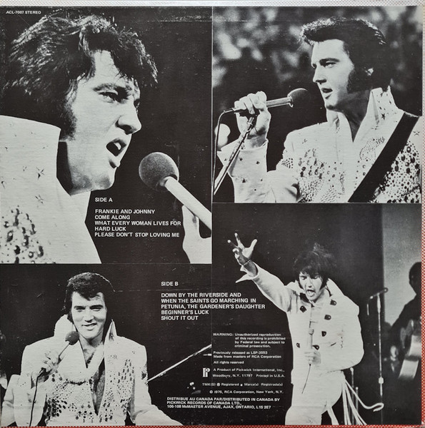 | Details : 1977 Release Front Cover : Photo of Elvis. Title across top. Catalogue number top left. Victor top right with Stereo beneath. Rear Cover : 9 photos of Elvis. Catalogue number top right Stereo LSP 3643. Printed in U.S.A. bottom centre. Label : Black dog near top. Flexible vinyl. Side A : RCA logo at top. Side B : RCA logo at top. Pressing Plant : Indianapolis Matrix Number Side A : TPRS - 3846 - 6 A2 (Machine Stamped) B (Hand Etched) Matrix Number Side B : TPRS - 3847 - 6S E (Hand Etched) A2 (Machine Stamped) *NOTE* Front cover "RE" bottom left in blue text. Rear cover "RE" bottom left black text. Bottom right "Library of Congress Card Number". Side A & B now replaces Side 1 & 2. |