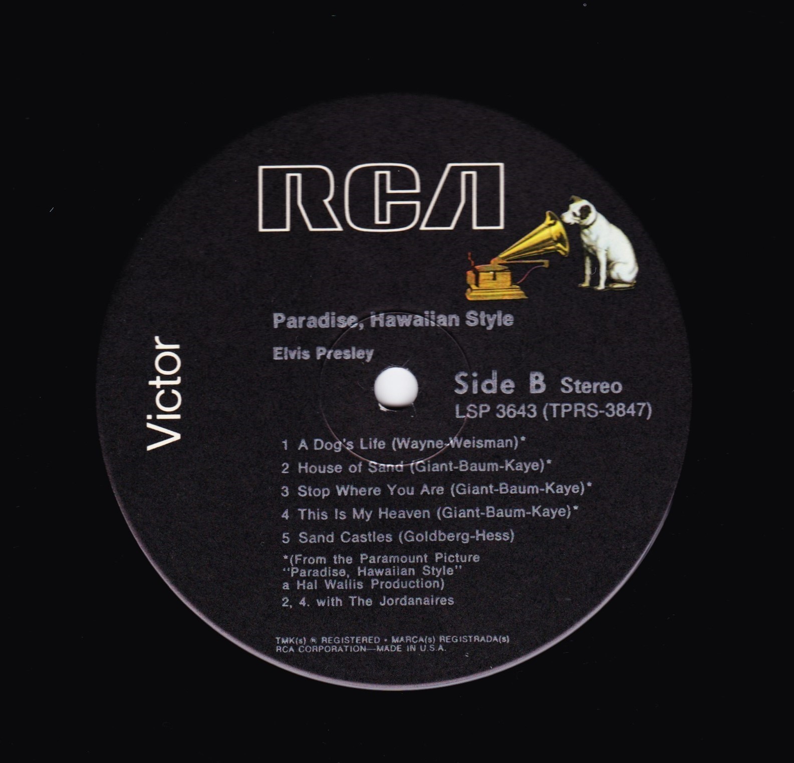 left. Rear Cover : 9 photos of Elvis. Catalogue number top right Mono LPM / Stereo LSP 3643. Printed in U.S.A. bottom left. Label : Black with silver lettering & dog on top. Side 1 : STEREO at bottom. Side 2 : STEREO at bottom. Pressing Plant : Indianapolis Matrix Number Side 1 : TPRS - 3846 - 2S A1 (Machine Stamped) Matrix Number Side 2 : TPRS - 3847 - 2S A4 (Machine Stamped) *NOTE* RCA Victor Logo in white. |