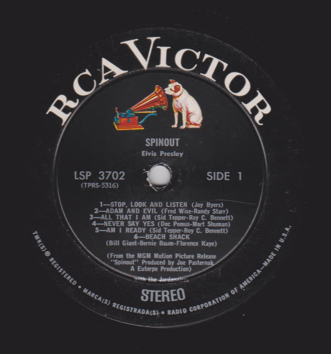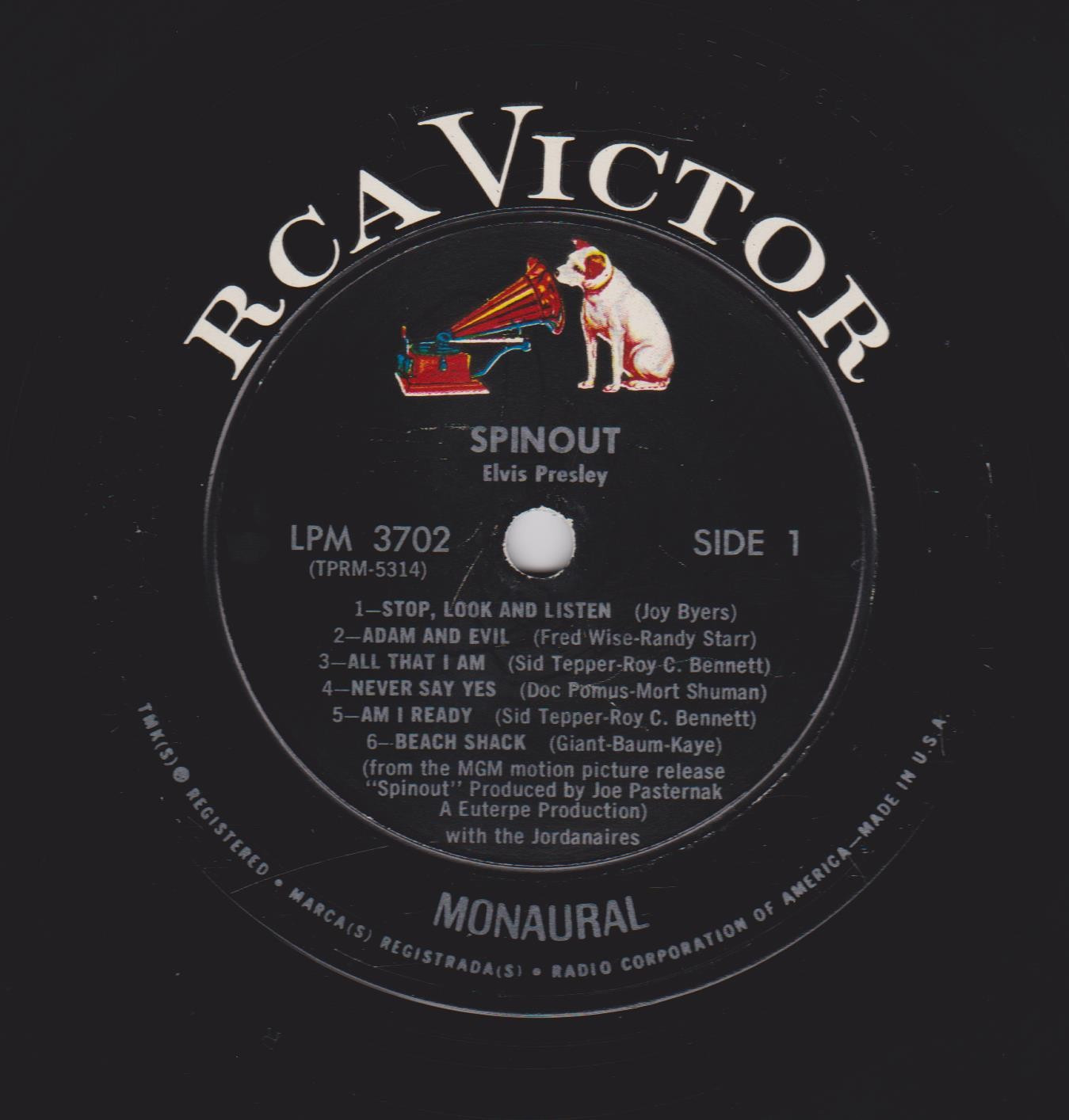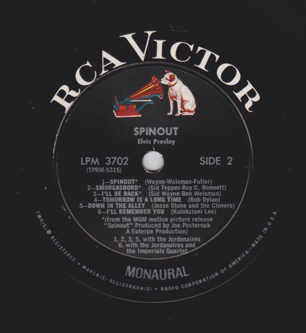 left. Rear Cover : 9 Photos of Elvis. Catalogue number top right Mono LPM 3702 / Stereo LSP 3702. Printed in U.S.A. bottom right. Label : Black with silver lettering & dog on top. RCA Victor Logo in white. Side 1 : STEREO at bottom. Side 2 : STEREO at bottom. Pressing Plant : Hollywood Matrix Number Side 1 : TPRS - 5316 - 5S A1 (Machine Stamped) Matrix Number Side 2 : TPRS - 5317 - 6S A (Machine Stamped) *NOTE* Hype Sticker attached to announce a 11 X 11 inch photo was given away free for a period during this release. It was enclosed inside the album. Side 1 song 6 on 2 lines. Side 2 MGM |