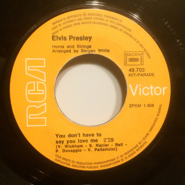 | Label: RCA Victor – 49.703 Series: Hit-Parade Format: Vinyl, 7", 45 RPM, Single, Limited Edition, Numbered Country: France Released: 1970 Printed By – S.I.A.T. Record Company – RCA Corporation Photography By – MGM (11). Made in France Special limited edition to promote the Elvis Show (That's the way it is) with a different cover for existing single! Rights Society (Boxed): SACEM SDRM SACD SGDL |