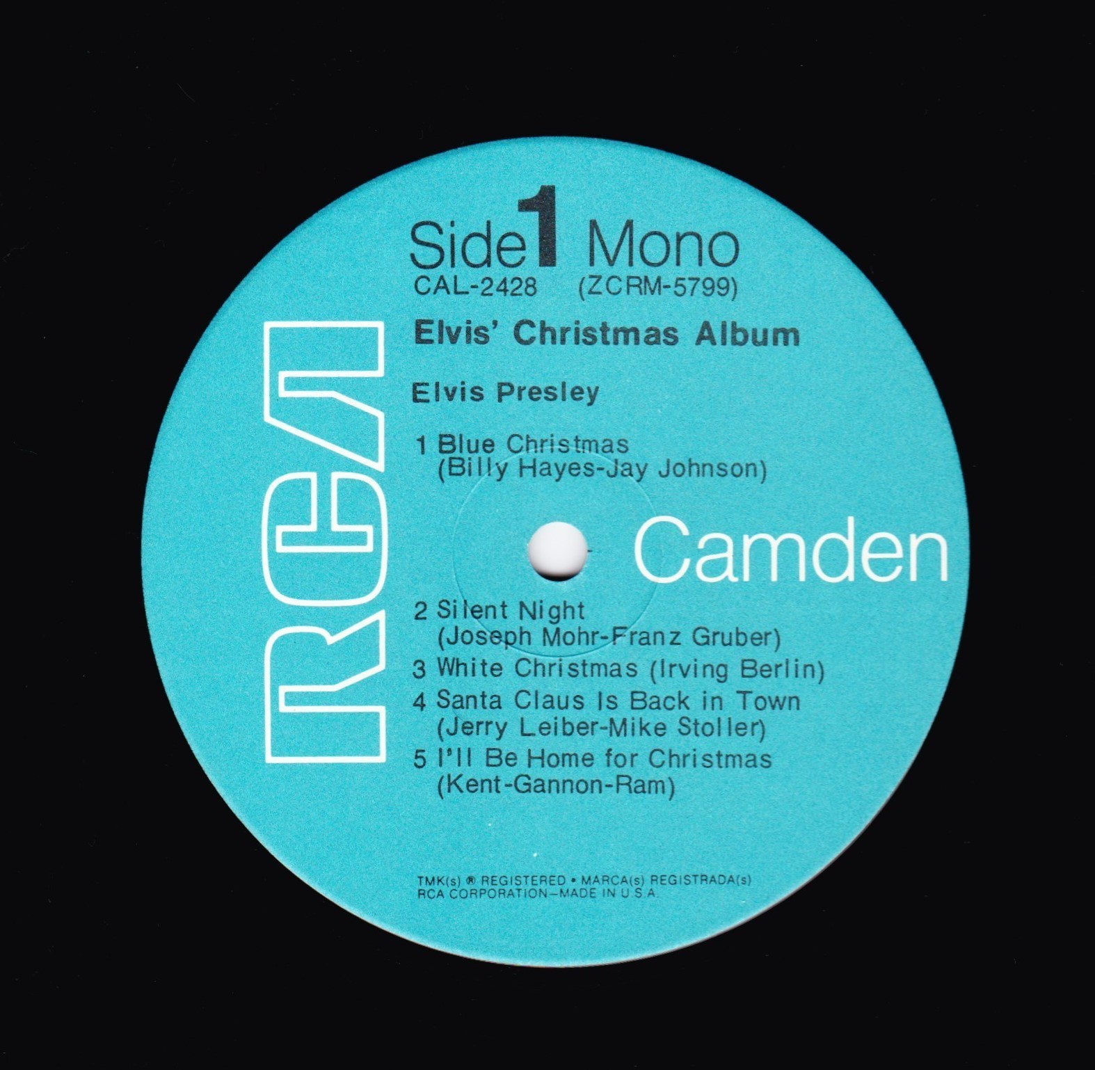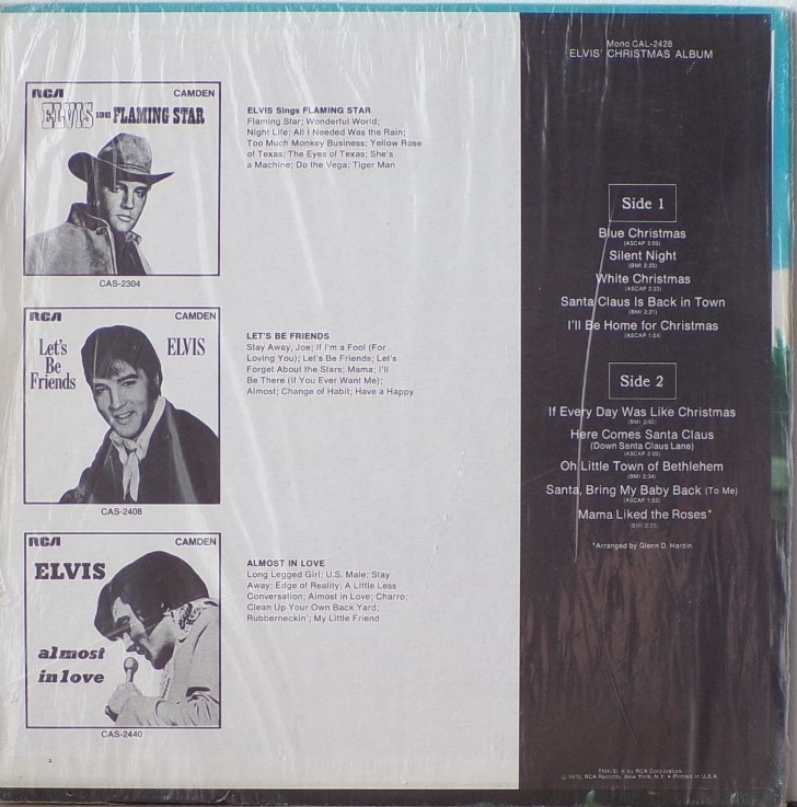 CHRISTMAS ALBUM (LP) The original Elvis' Christmas Album was out of print by the late 1960s. Interest in the album prompted RCA to re-release it in an altered version on its budget label RCA Camden in November, 1970. This version eliminated the four gospel tracks from the Peace in the Valley EP and added the 1966 holiday single "If Every Day Was Like Christmas," along with the 1970 non-seasonal B-side "Mama Liked the Roses", issued as the flip to Elvis' top ten single "The Wonder of You." With ten tracks and a shorter running time, it fit the standard for the budget label issues. The religious and secular Christmas songs were also mixed. The initial cover of this revised version echoed that of the 1958 reissue, except a more recent mid-60s vintage photograph with Elvis wearing a blue racing jacket with two white stripes on the left was used from the set of the 1967 movie Speedway. The album was also released in the UK with an album cover that featured Elvis' face from the 1970 Camden release in a circle in the middle surrounded in white with the title and the song selections in red, RCA Camden 1155. Details : Front Cover : Photo of Elvis. Title top right.