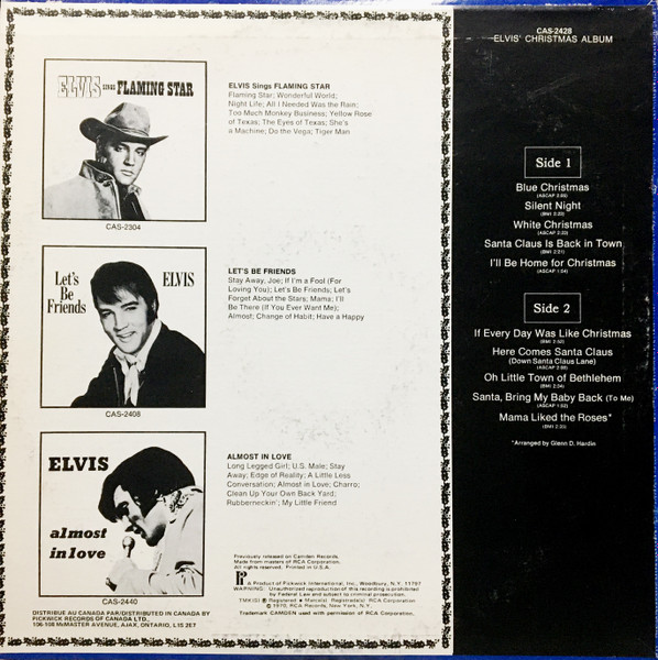 | Label: Pickwick – CAS-2428 Format: Vinyl, LP, Album, Mono, Reissue, Keel Press Country: Canada. Released: 1975 Copyright – RCA Records Trademark Camden used with kind permission of RCA Corporation. Printed in U.S.A. Made from masters of RCA Corporation. All Rights Reserved. Distributed in Canada By Pickwick Records Of Canada LTD., 106-108 McMaster Avenue, Ajax, Ontario, L1S 2E7 On the front cover STEREO is mentioned, while the labels states MONO Rights Society: BMI |