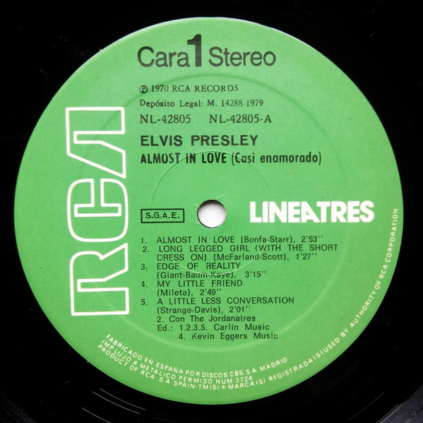 | Details : 1976 Release Front Cover : Photo of Elvis. Title top right. Catalogue number top left. Rear Cover : 3 Photos of Elvis. Catalogue number & song titles top right. Printed in U.S.A. bottom centre. Label : Tan. Rigid vinyl. Side 1 : Stereo at top. Side 2 : Stereo at top. Pressing Plant : Unknown. Matrix Number Side 1 : XPRS - 2468 - 32S A5 (Machine Stamped) LSP 4428 A (Hand Etched) Matrix Number Side 2 : ZPRS - 2469 - 35S A1 (Machine Stamped) LSP 4428 B (Hand Etched) *NOTE* Rigid vinyl 160grams in weight. The "I" for Indianapolis is crossed through so pressing plant unknown. The grey border on rear cover much darker tone to the previous releases. |
