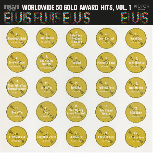 50 GOLD AWARD HITS, VOLUME 1 (4 x LP) Details : *NOTE* This box is bound to the left and opens like a book. Front cover gold records 1 - 25 are a flat gold colour, but the rear cover gold records 26 - 50 are a bright gold colour. The first above booklet came with this release. Worldwide 50 Gold Award Hits Vol. 1 is a compilation album by Elvis Presley. The album was released in August, 1970, as his 38th album. It was certified Gold on 2/13/1973, Platinum on 3/27/1992 and 2x Platinum on 6/17/1992 by the RIAA. This is a 4 LP box set and was released with 2 different photo albums included. |