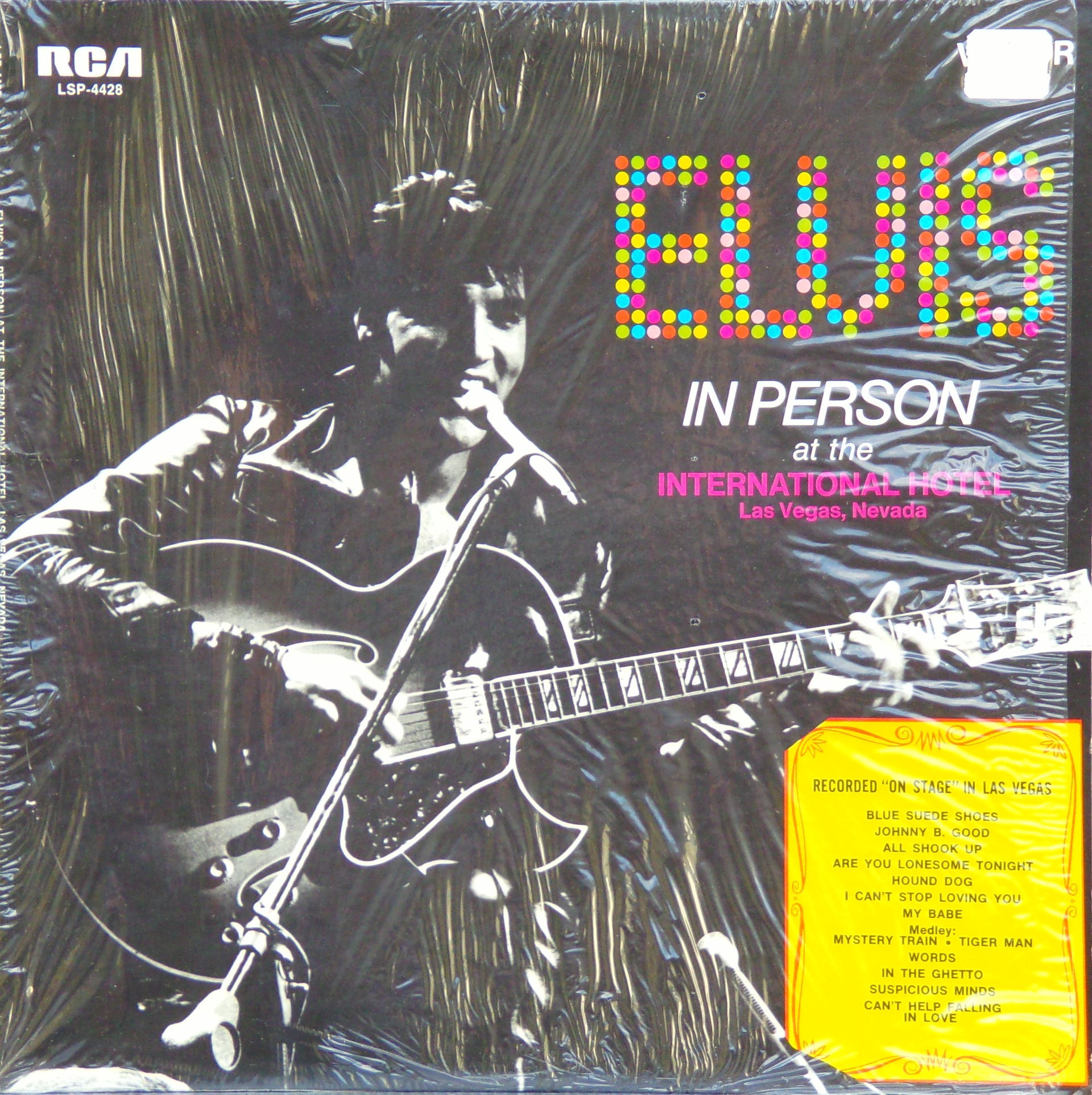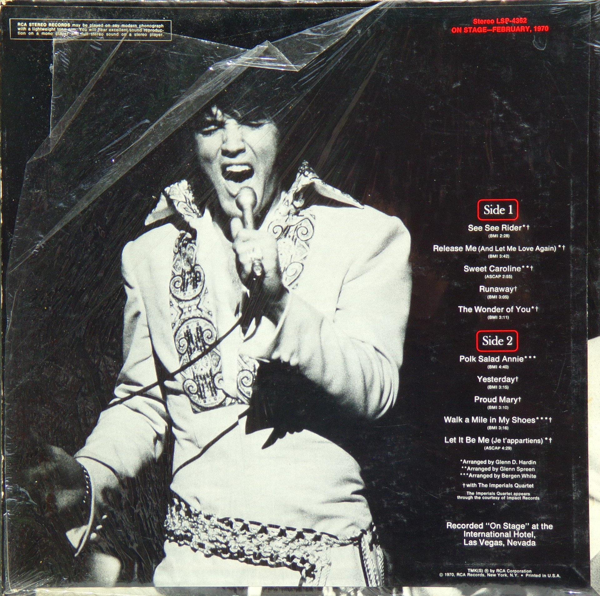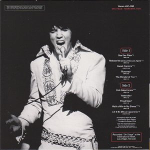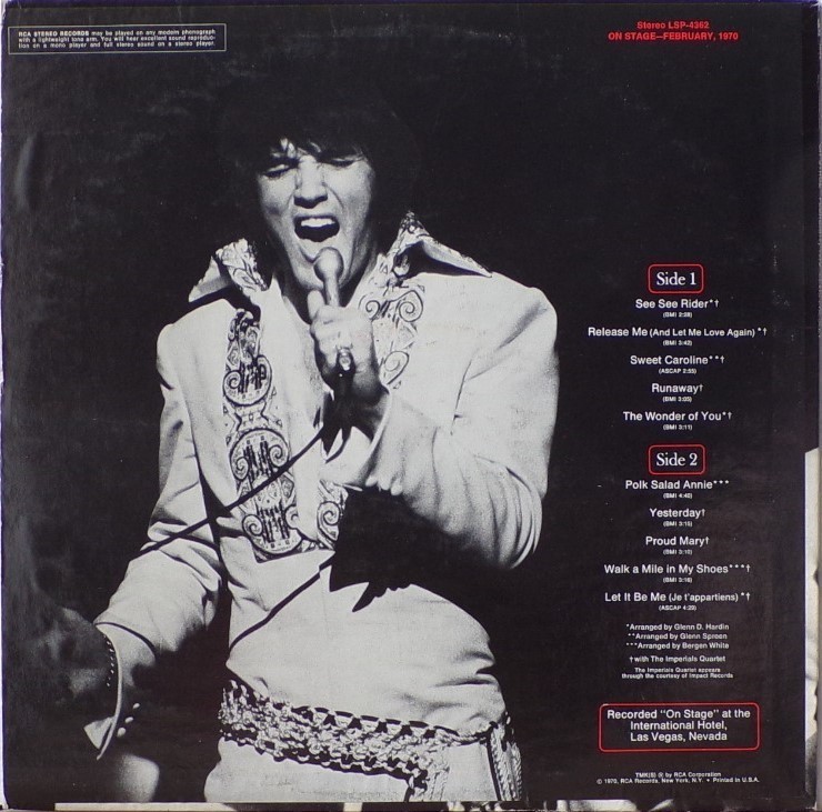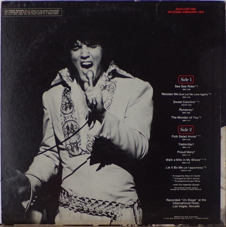 International Hotel, Las Vegas, August 25, 1969 DS On Stage is an Elvis Presley live album recorded between February 17 and 19, 1970 at the International Hotel, Paradise, Nevada. Released on RCA Records LSP-4362.It features the world-wide #1 single "The Wonder of You", which topped both the United States AC tracks chart and the British music chart. It was an immediate follow up to From Memphis to Vegas/From Vegas to Memphis, which also featured live recordings. Unlike the previous release, however, this album focused on songs that were not, at the time, associated with Elvis. This album was released in June 1970 and peaked on the chart in July 1970. It was certified Gold on 2/23/1971 and Platinum on 7/15/1999 by the RIAA. Other selections include "See See Rider", Paul McCartney's "Yesterday", Tony Joe White's "Polk Salad Annie", Del Shannon's "Runaway", and a version of "Let It Be Me". "See See Rider" would go on to become Elvis' frequent introductory number at his concerts, while "Polk Salad Annie" also became a regular part of his repertoire. The album is notable for not showing Elvis' name anywhere on the cover. The album has remained in print since its release date and has sold more than ten million copies globally. On January 8, 2010 it was announced that a Legacy Edition would be released, to follow the Legacy Edition release of "From Elvis In Memphis", in the spring of 2010. Details : Front Cover : Photo of Elvis. Title on top. Catalogue