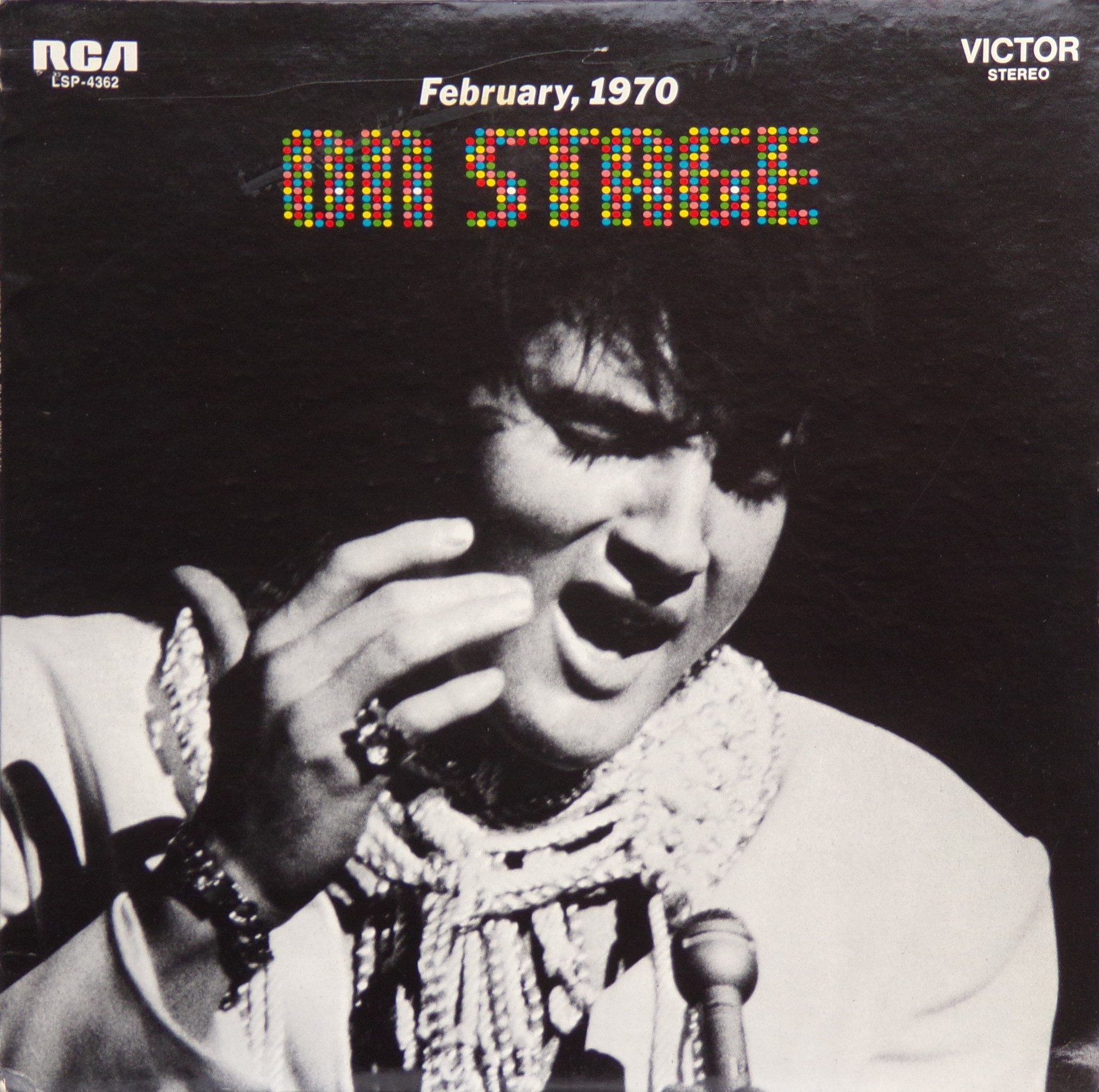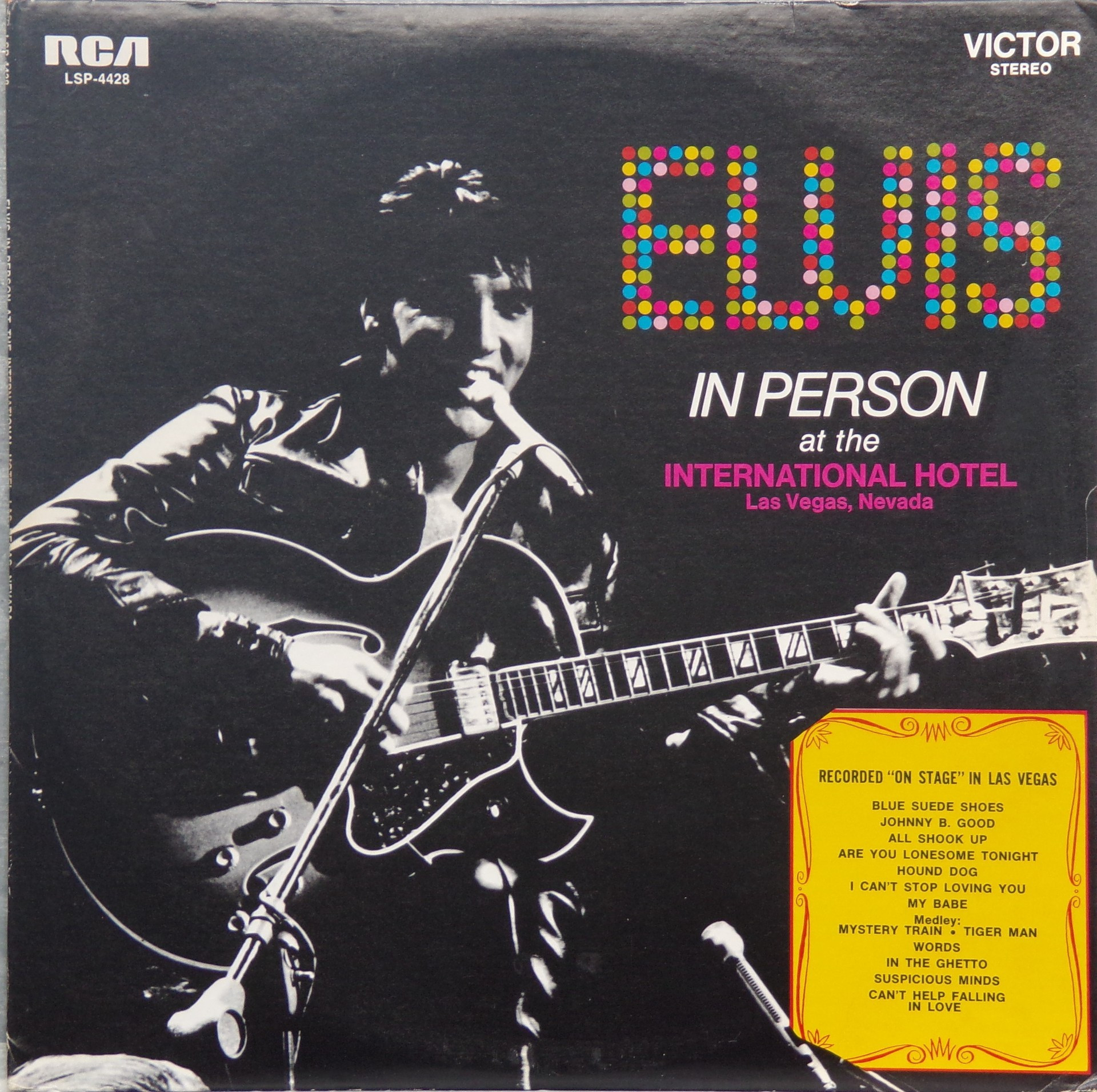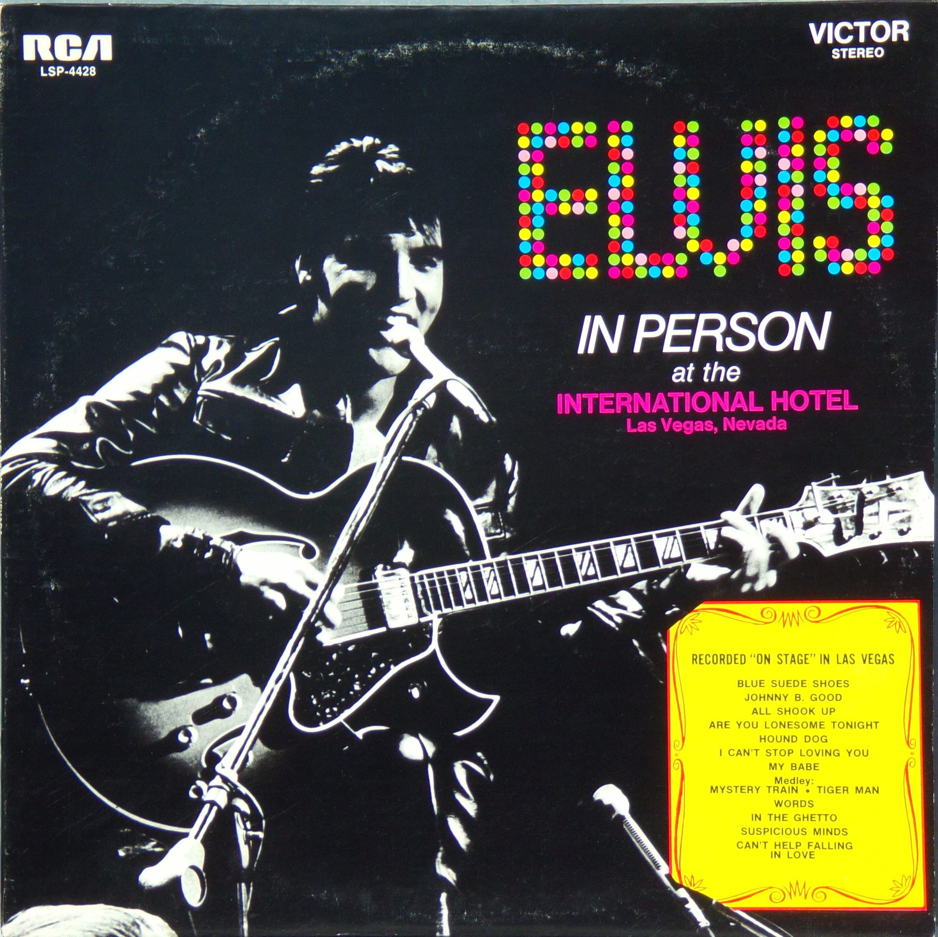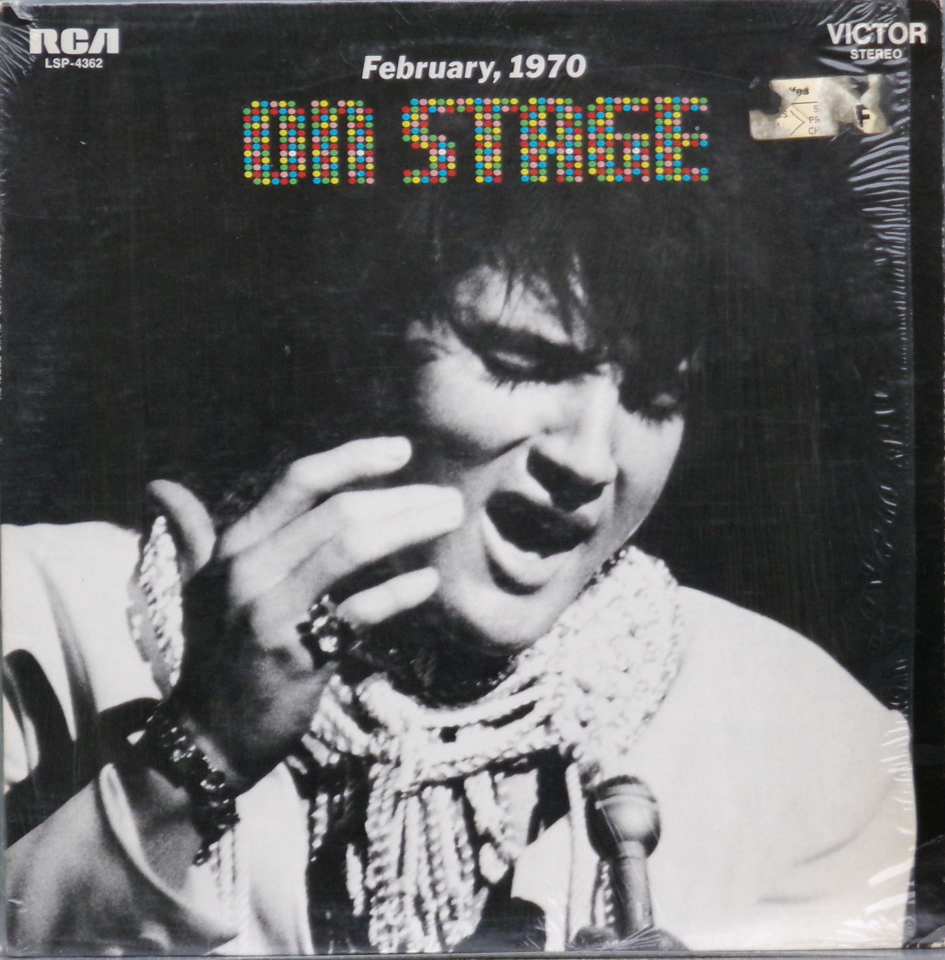 International Hotel, Las Vegas, August 25, 1969 DS On Stage is an Elvis Presley live album recorded between February 17 and 19, 1970 at the International Hotel, Paradise, Nevada. Released on RCA Records LSP-4362.It features the world-wide #1 single "The Wonder of You", which topped both the United States AC tracks chart and the British music chart. It was an immediate follow up to From Memphis to Vegas/From Vegas to Memphis, which also featured live recordings. Unlike the previous release, however, this album focused on songs that were not, at the time, associated with Elvis. This album was released in June 1970 and peaked on the chart in July 1970. It was certified Gold on 2/23/1971 and Platinum on 7/15/1999 by the RIAA. Other selections include "See See Rider", Paul McCartney's "Yesterday", Tony Joe White's "Polk Salad Annie", Del Shannon's "Runaway", and a version of "Let It Be Me". "See See Rider" would go on to become Elvis' frequent introductory number at his concerts, while "Polk Salad Annie" also became a regular part of his repertoire. The album is notable for not showing Elvis' name anywhere on the cover. The album has remained in print since its release date and has sold more than ten million copies globally. On January 8, 2010 it was announced that a Legacy Edition would be released, to follow the Legacy Edition release of "From Elvis In Memphis", in the spring of 2010. Details : Front Cover : Photo of Elvis. Title on top. Catalogue