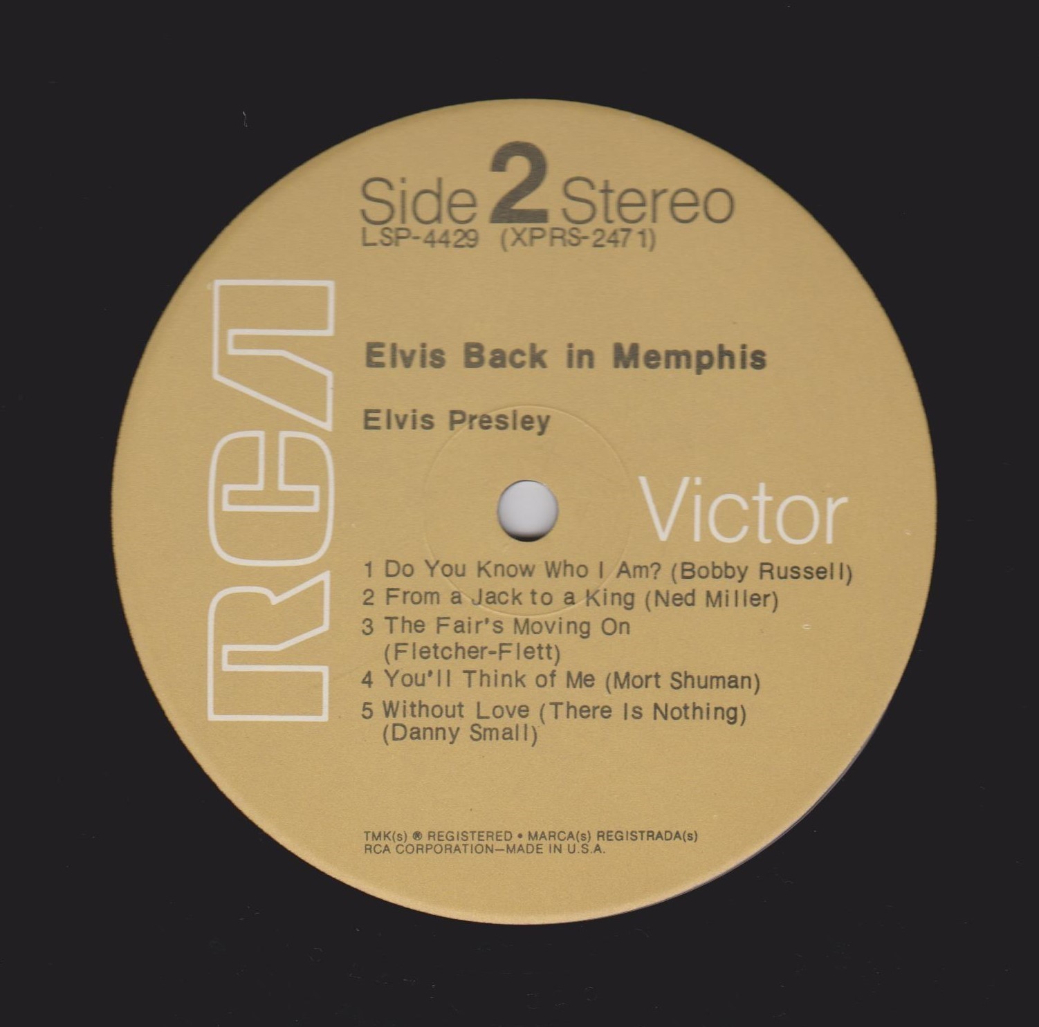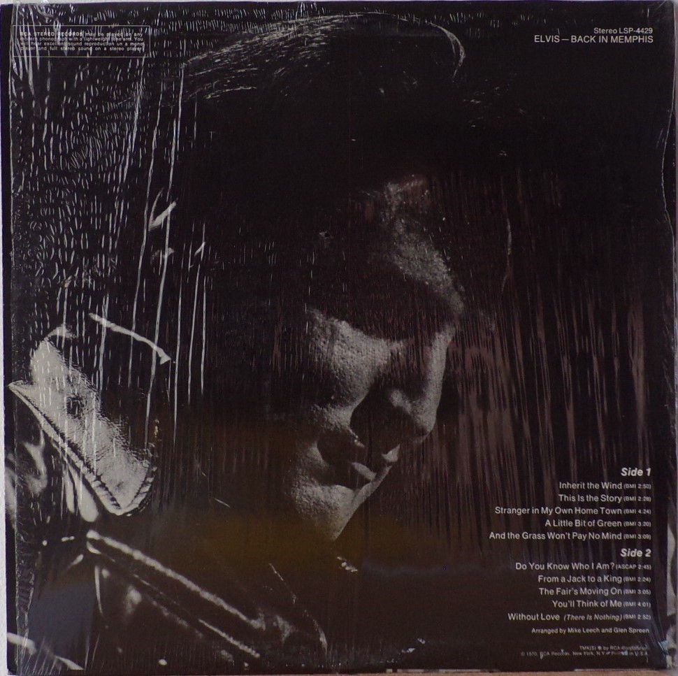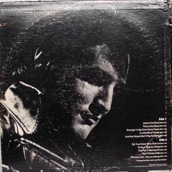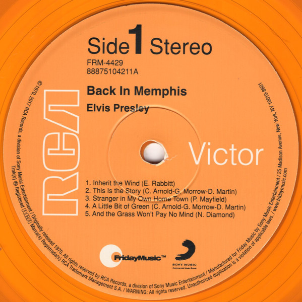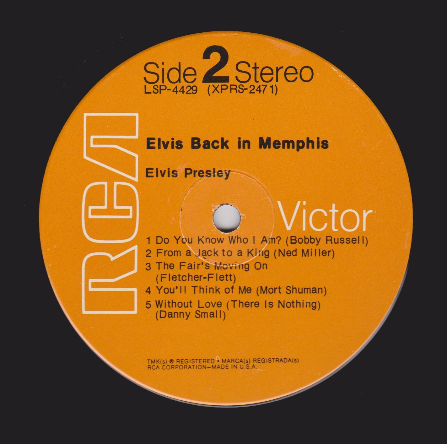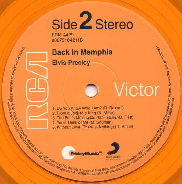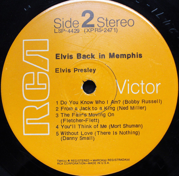 IN MEMPHIS (LP) Brief History : This single LP is the second half of the double album "LSP-6020 From Memphis to Vegas / From Vegas to Memphis". In November 1970, RCA reissued this as an individual album. It has been issued separately ever since. Label: RCA Victor – LSP-4429 1st pressing with orange labels. Matrix / Runout (Side A Label): XPRS 2470 |