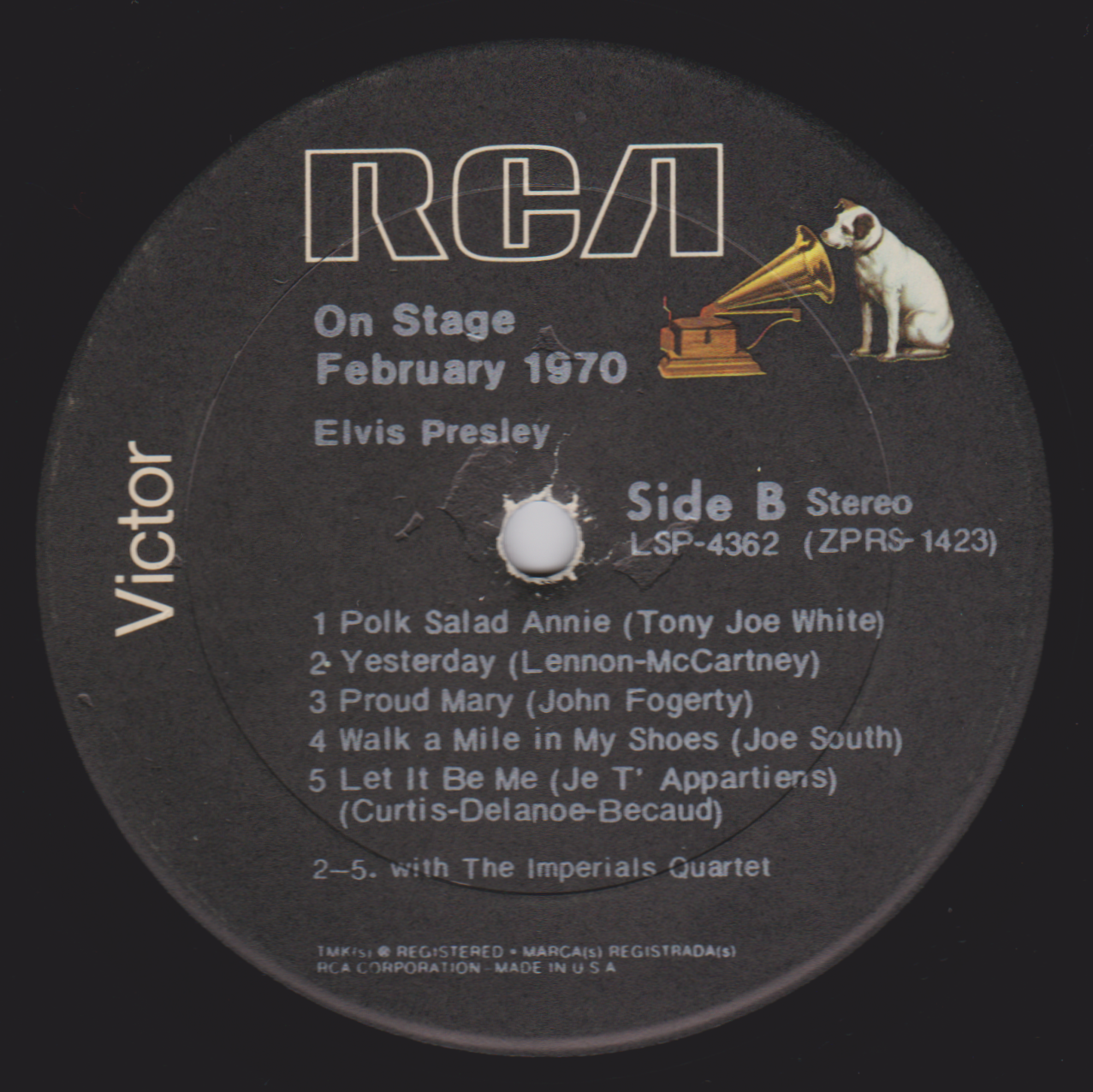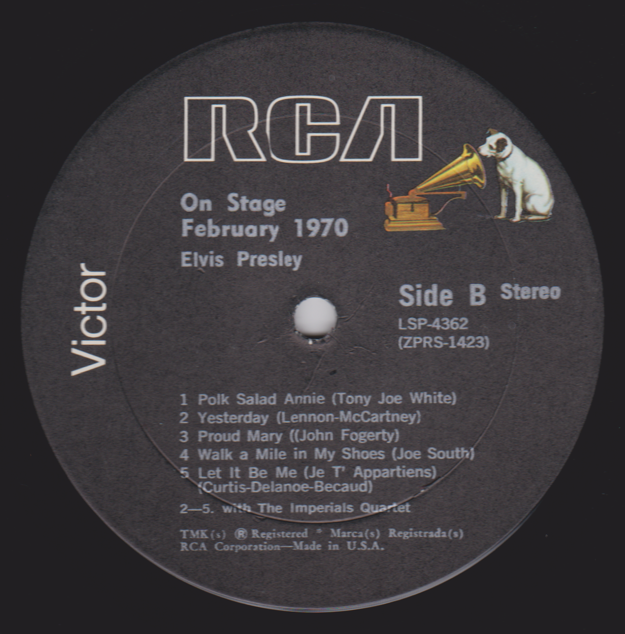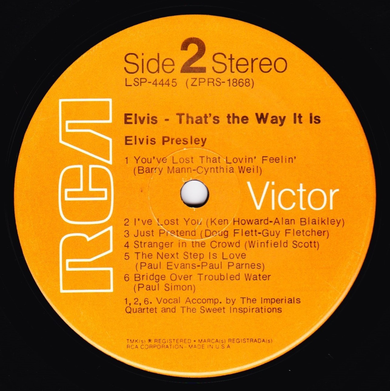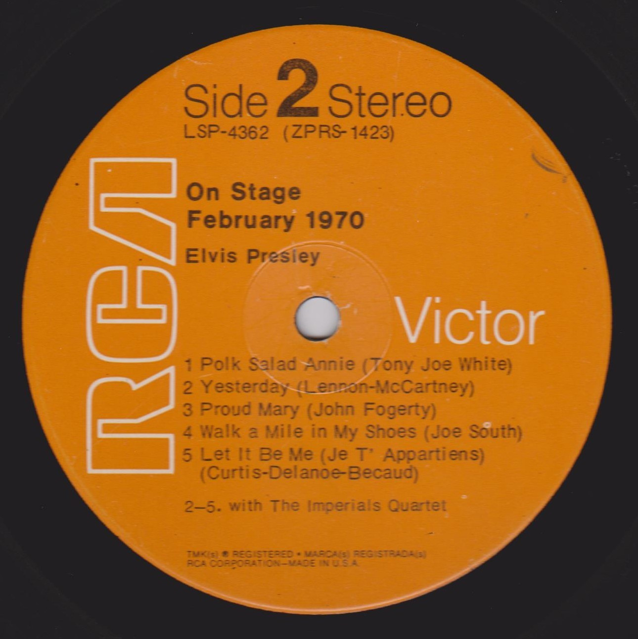IN MEMPHIS (LP) Brief History : This single LP is the second half of the double album "LSP-6020 From Memphis to Vegas / From Vegas to Memphis". In November 1970, RCA reissued this as an individual album. It has been issued separately ever since. Label: RCA Victor – LSP-4429 1st pressing with orange labels. Matrix / Runout (Side A Label): XPRS 2470 |