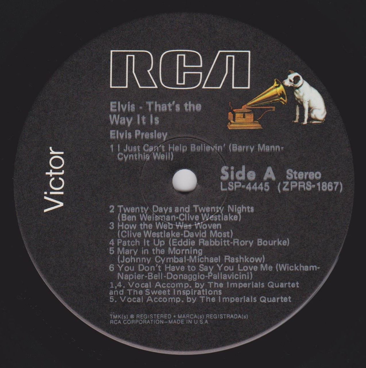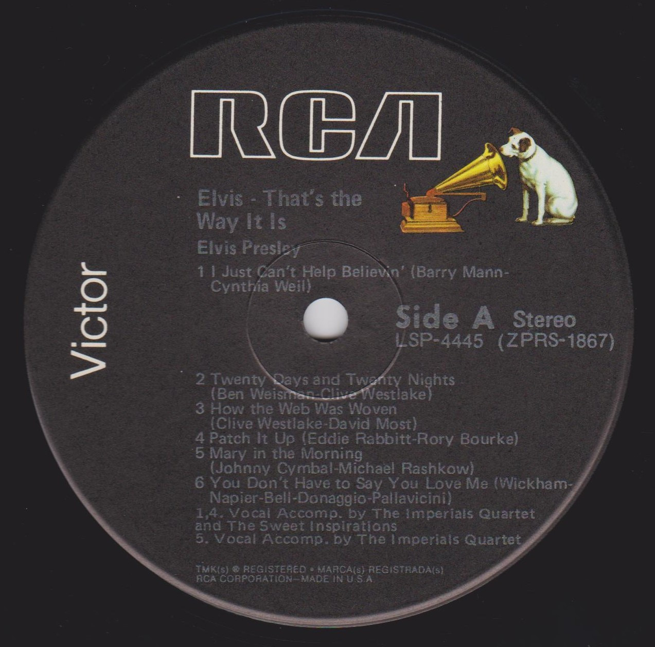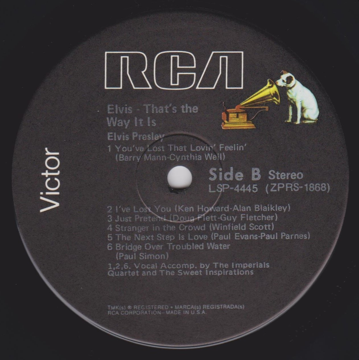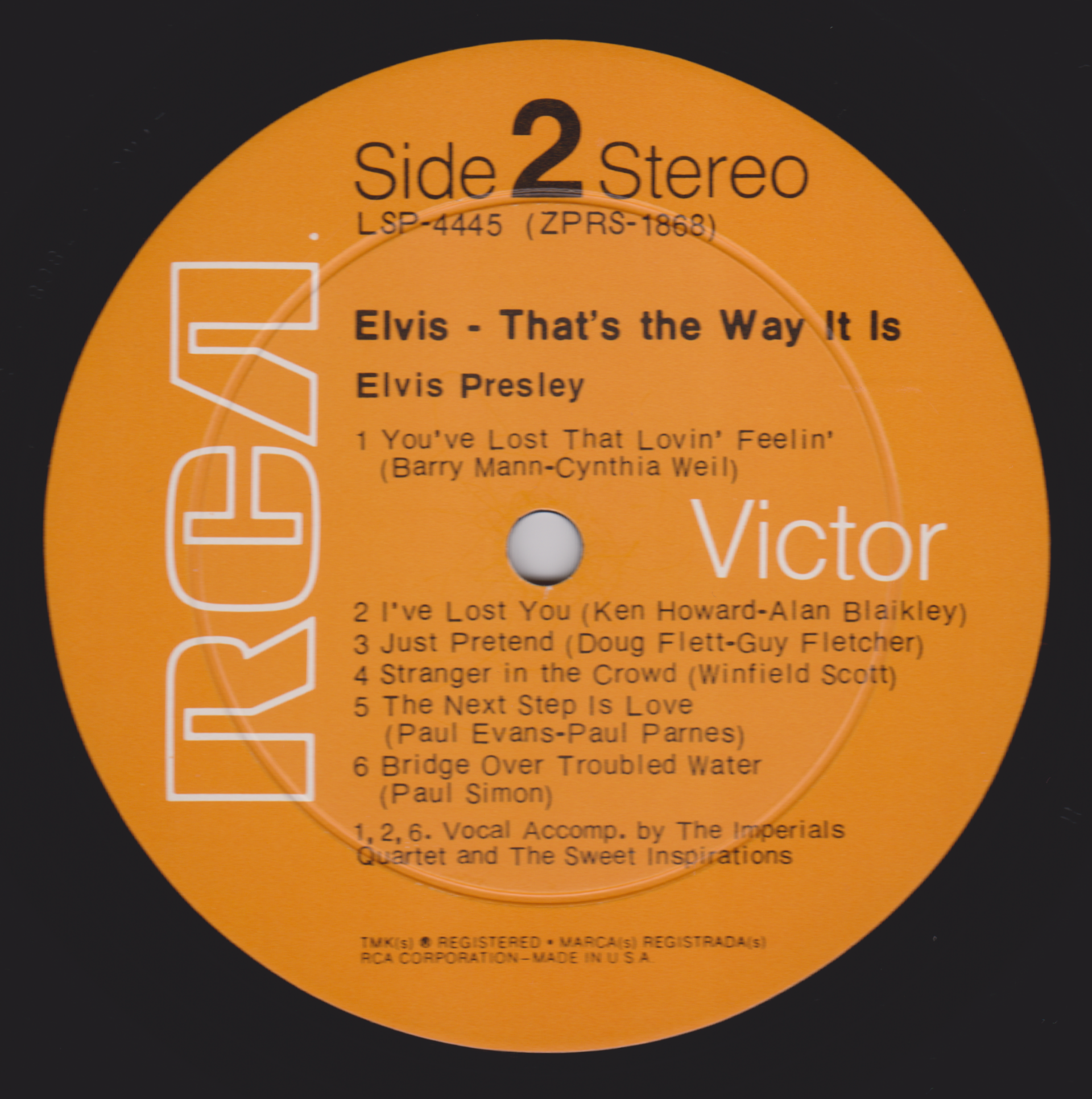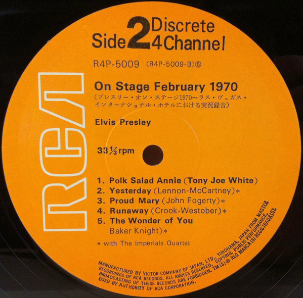 Label: RCA – R4P-5009 Manufactured By – Victor Company Of Japan, Ltd. Accompanied By – The Imperials Quartet* (tracks: A1-A5, B2-B5) Includes 12x12 lyric insert. One side in English (lyrics), One side in Japanese (liner notes.) Japanese QuadraDisc CD-4 4-Channel Discrete quadraphonic LP release. Back cover states "Manufactured by Victor Musical Industries, Inc." while the record labels read "Manufactured by Victor Company of Japan" Ltd." Matrix / Runout (Side A Label): R4P-5009-A |