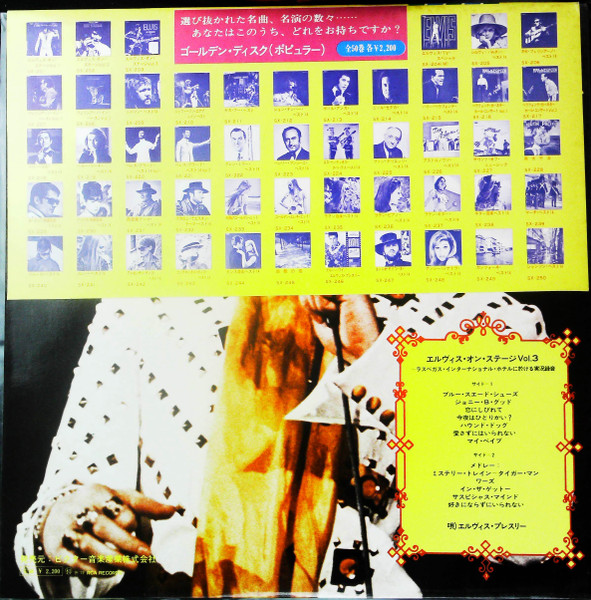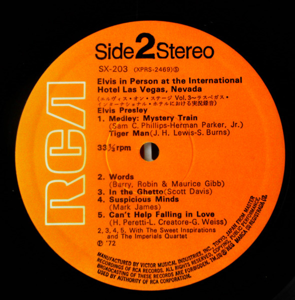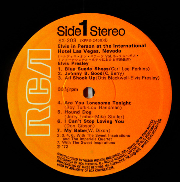 | Label: RCA – SX-201 Series: Golden Disk Format: Vinyl, LP, Album, Reissue, Box Country: Japan Released: Oct 1972 Manufactured By – Victor Musical Industries, Inc. Later Japanese pressing packaged in a box with obi and 6-page booklet containing Japanese liner notes and lyrics in English. Japanese title is "Elvis On Stage Vol. 1" and it appears on the obi, the spine of the box and both labels. Matrix / Runout (Runout - Side A - stamped): JS Ⓑ ZPRS 1867