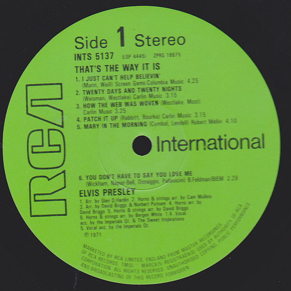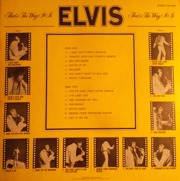 Recorded: RCA Studio B, Nashville, June 4, 1970 Brief History : Elvis: That's the Way It Is is the 40th album by Elvis Presley, released on RCA Records, LSP 4445, in November 1970. It consists of eight studio tracks recorded at RCA Studio B in Nashville, and four live in-concert tracks recorded at The International Hotel in Las Vegas. It accompanied the theatrical release of the documentary film of the same name (although it is not generally considered a soundtrack album), and peaked at #21 on the Billboard 200. It was certified gold on June 28, 1973 by the RIAA. The original vinyl LP consisted of eight tracks recorded in the studio in Nashville at the marathon sessions in June 1970 that would also yield several singles and the Elvis Country album, and four tracks from his August 1970 engagement at The International Hotel in Las Vegas. The track "You Don't Have to Say You Love Me" had been released as the advance single on October 6; its b-side "Patch It Up" appears in a live version here. "The Next Step Is Love" had previously been released as a b-side in July 1970, and its A-side "I've Lost You" appears in a live version here as well. The concert version of "I Just Can't Help Believin'" from this album would be released as a single in the United Kingdom in November 1971 and go to #6 on their charts; its b-side "How the Web Was Woven" was also taken from this album. A rehearsal version of the latter song was featured in the 1970 documentary Elvis: That's the Way It Is. Details : 1970 Release |