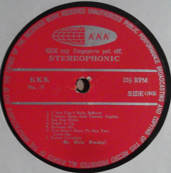 | Label: KKK (2) – No. 38 Format: Vinyl, LP, Album, Unofficial Release Country: Singapore Released: 1970 While the cover of this record seeks to pass it off as a legitimate version of RCA-Victor LSP-4445 - even down to claiming "Printed in U.S.A." on the back - it is in fact an unofficial release (or "pirate" record as they were known in Southeast Asia). The KKK record label was never registered at the Singapore Patent Office as claimed, since no such label officially existed. The pirates even had the nerve to print "unauthorised...copying of this record prohibited" around the edge of the label when that is exactly what they were doing ! Note that all titles are as shown on the labels (there are some minor differences to the list of titles printed in the centre of the back cover. The title sequence varies from that on the original release, and includes some extra titles and tracks. Strangely, the back cover also lists the original titles in the correct sequence ( showing 6 tracks each side when the record actually has seven). Finally, the catalogue number of this release was also assigned to another completely different record on the KKK label ("Let It Be" by the Beatles). |