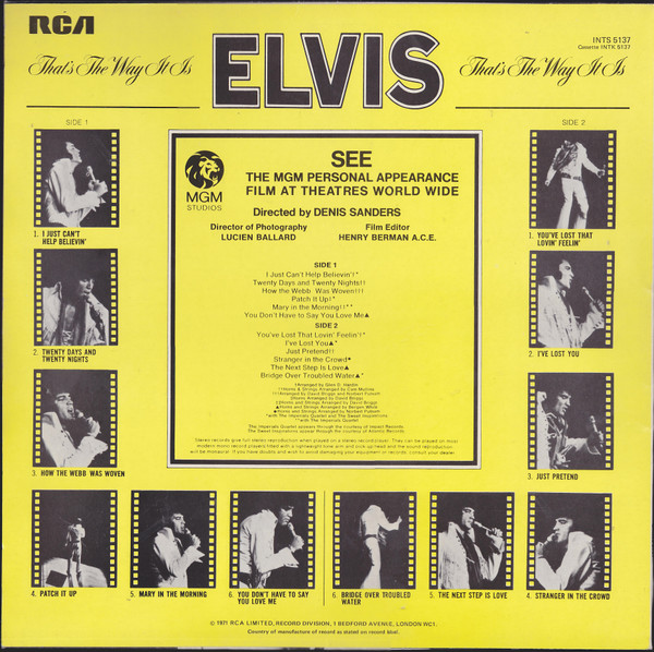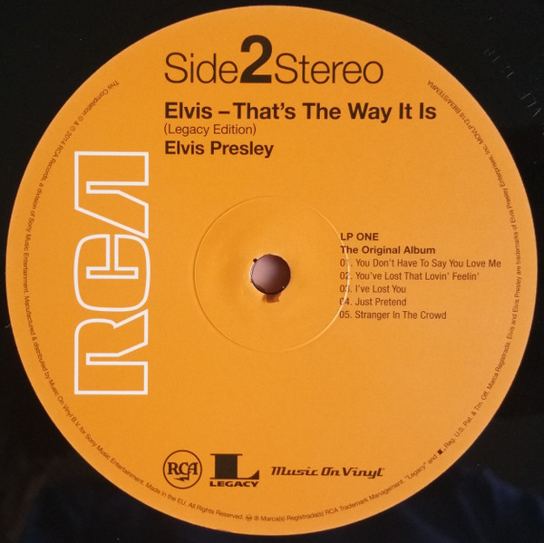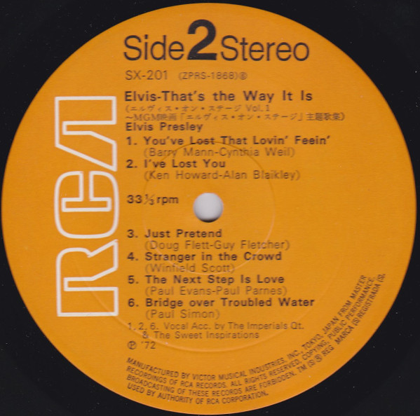 Label: RCA – SX-58 Manufactured By – Victor Company Of Japan, Ltd. Backing Vocals – The Imperials Quartet* (tracks: A1 to A5, B2 to B5) Second Japanese edition with obi, laminated gatefold sleeve and bound-in booklet with lyrics in Japanese & English. Orange RCA labels. The obi text makes reference to the MGM film, That's The Way It Is, which came out after this album. Pressed on translucent (see-thru) vinyl. Matrix / Runout (Label side A): ZPRS-1422 |