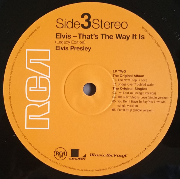 Sony Music Commercial Music Group – 88875104211 Format: Vinyl, LP, Limited Edition, Reissue, Gold Country: USA & Europe Released: 2018 Copyright – RCA Records Arranged By – Glen Spreen, Mike Leech Pressed on translucent 180 gram gold vinyl. Comes in a gatefold cover. Also includes a 24" x 24" poster. Copyright 1970, 2017 RCA Records. Originally released 1970. First and Second catalog found on front and back cover, labels