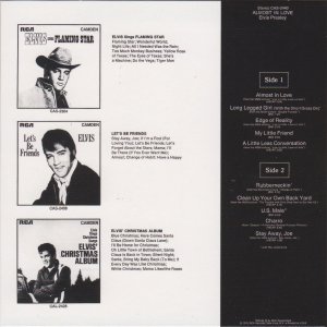 | Details : 1971 Release Front Cover : Photo of Elvis. Title on top. Catalogue number top left. Rear Cover : Photo of Elvis. Catalogue number top right. Printed in U.S.A. bottom right. Label : Orange. Flexible vinyl. Side 1 : Stereo at top. Side 2 : Stereo at top. Pressing Plant : Rockaway Matrix Number Side 1 : ZPRS - 1422 - 3S A2 (Machine Stamped) Matrix Number Side 2 : ZPRS - 1423 - 4S A3 (Machine Stamped) *NOTE* The album title on the rear cover and top line is in complete red lettering. The side 1 & side 2 are surrounded by a red border. The bottom recording announcement text has no red border. |