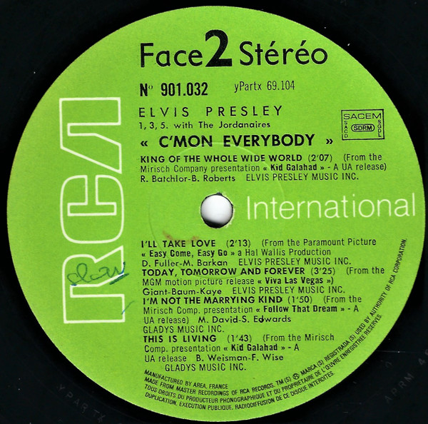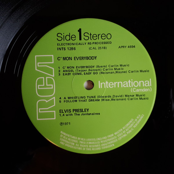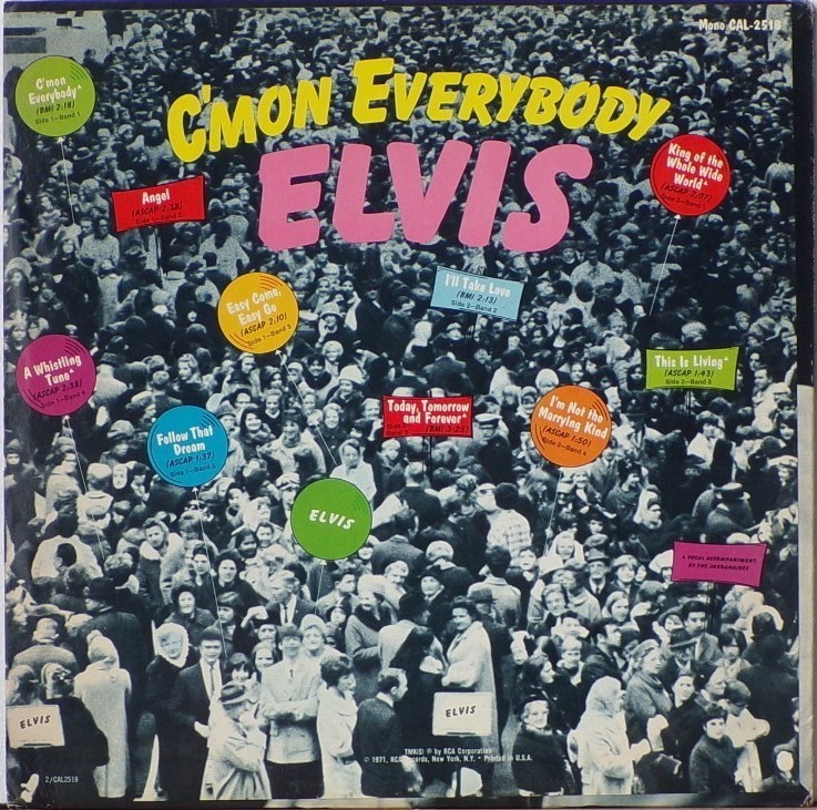 EVERYBODY (LP) Brief History : C'mon Everybody is a compilation album by Elvis Presley. The album was released in July 1971. All tracks from this album originated from four of Elvis's films and were only released on soundtrack EP's prior to this issue. The remaining EP tracks from the same four movies were compiled into another album, "I Got Lucky", released three months later. It was certified Gold on 1/6/2004 by the RIAA. Front Cover : Photo of Elvis. Title top right. Catalogue