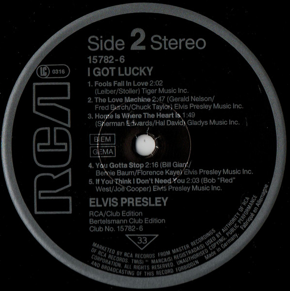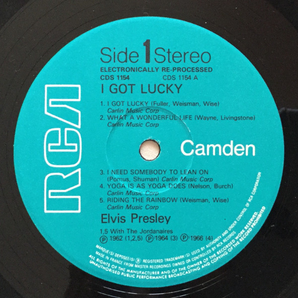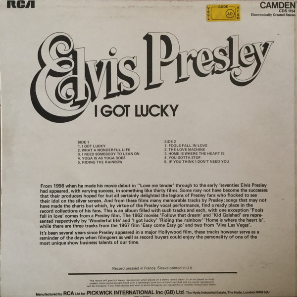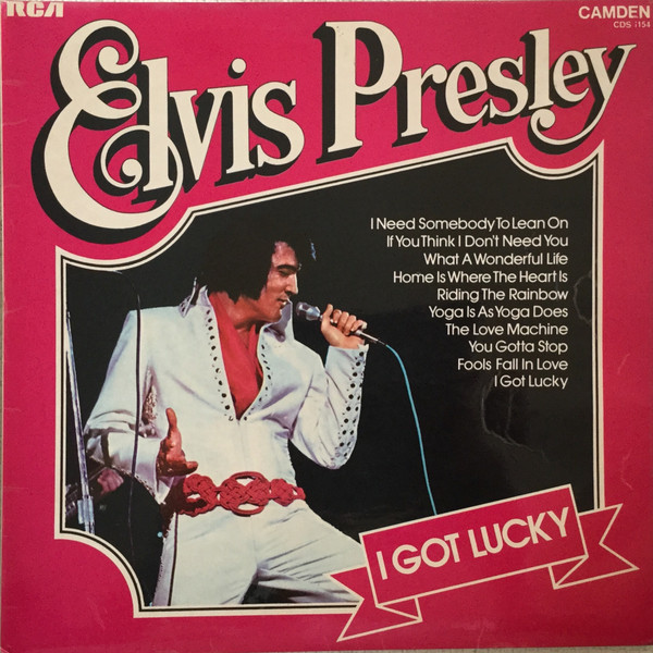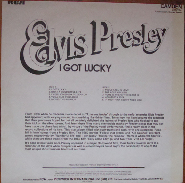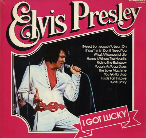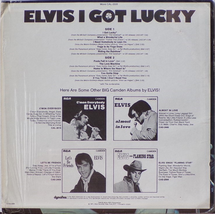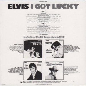 GOT LUCKY (LP) Brief History : I Got Lucky is a compilation album by Elvis Presley. The album, released in October 1971, is a follow-up to the "C'mon Everybody" album as it features the remaining tracks from the soundtrack EP's (previously unissued on LP) of the same four films from the first compilation plus one non-movie/non-LP track. It was certified Gold on 1/6/2004 and Platinum on 9/15/2011 by the RIAA. Front Cover : Photo of Elvis. Title top right. Catalogue