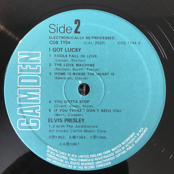 number top left. Camden top left. *NOTE* Rear cover number "2" bottom right. Copyright – RCA Records This is for an RCA Records Indianapolis pressing of the CAL-2533 catalog number. This release has the blue RCA Camden labels and a cover code "2" printed on the back bottom right corner of the cover. The first catalog number appears on the spine, front and back covers and labels. The second catalog number appears on the bottom left corner of the back cover. This release is very similar in label and cover composition (aside from the lack of a printed cover code) to Elvis Presley - I Got Lucky. Matrix / Runout (Side A label): ACRM-5837 |