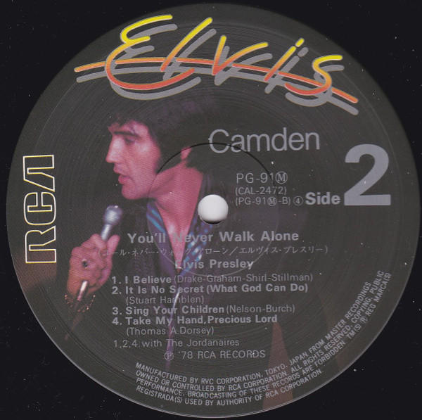 | Label: RCA Camden – PG-91(M) Series: 永遠のエルヴィス・メモリアル ・シリーズ – 5 Format: Vinyl, LP, Album, Compilation, Reissue, Stereo, Mono Country: Japan Released: Aug 1978 Phonographic Copyright ℗ – RCA Records Released with obi and insert containing Japanese liner notes and series discography (10 LPs that retailed for 1,500 yen each.) English lyrics appear on the back cover. Tracks 1 to 3 and 5 on Side 1 are in stereo. The track Swing Down, Sweet Chariot, which is on other versions of this album, is omitted here. Matrix / Runout (Runout Side A - Stamped): PG 91MA 111 |