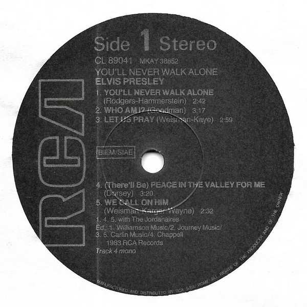 NEVER WALK ALONE (LP) (US) RCA Camden CAL 2472 Released: March 1971 Side 1 You'll Never Walk Alone Who Am I * Let Us Pray ** Peace In The Valley We Call On Him Side 2 I Believe It Is No Secret (What God Can Do) Sing You Children Take My Hand, Precious Lord * Recorded: American Studios, Memphis,
