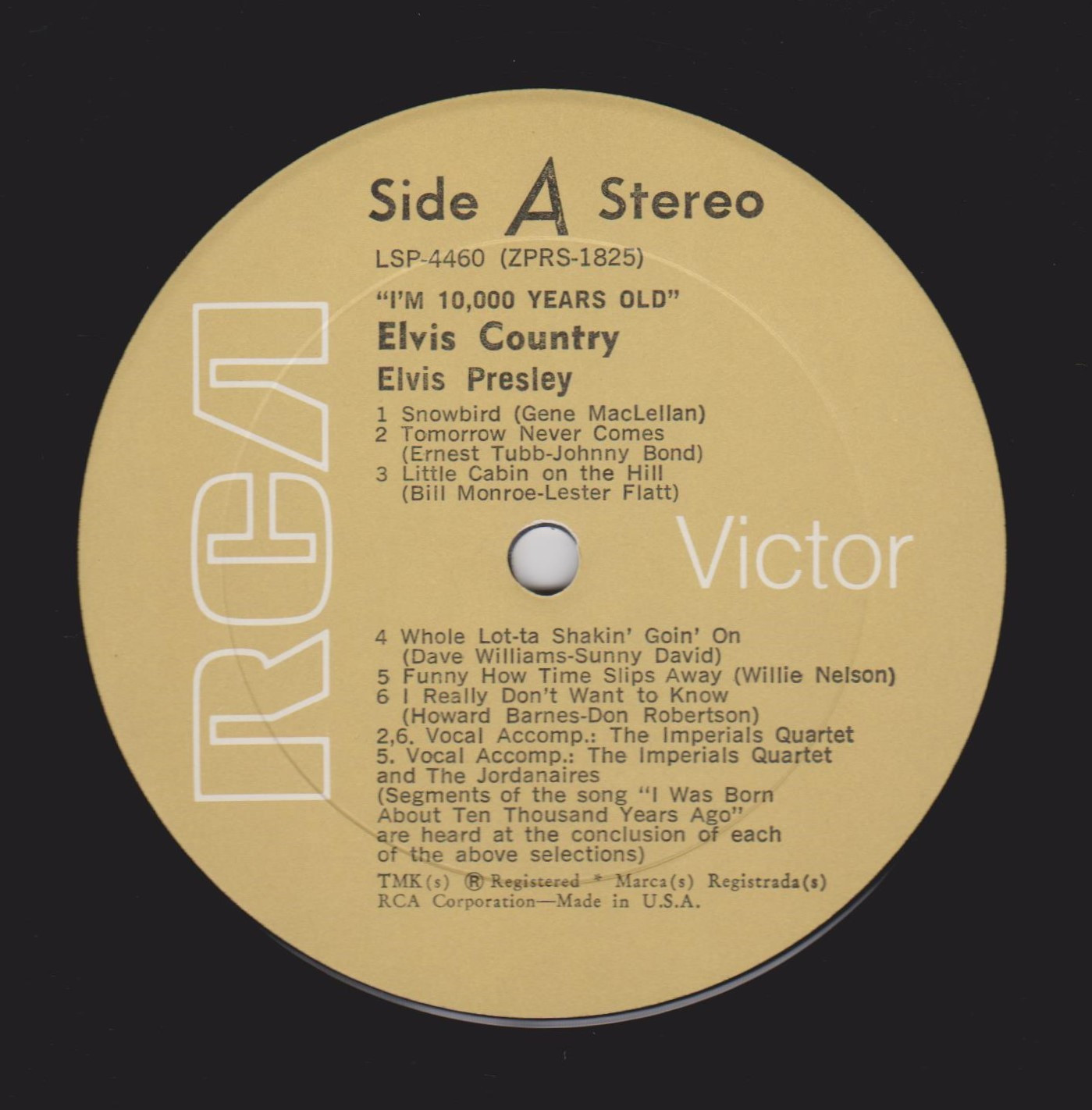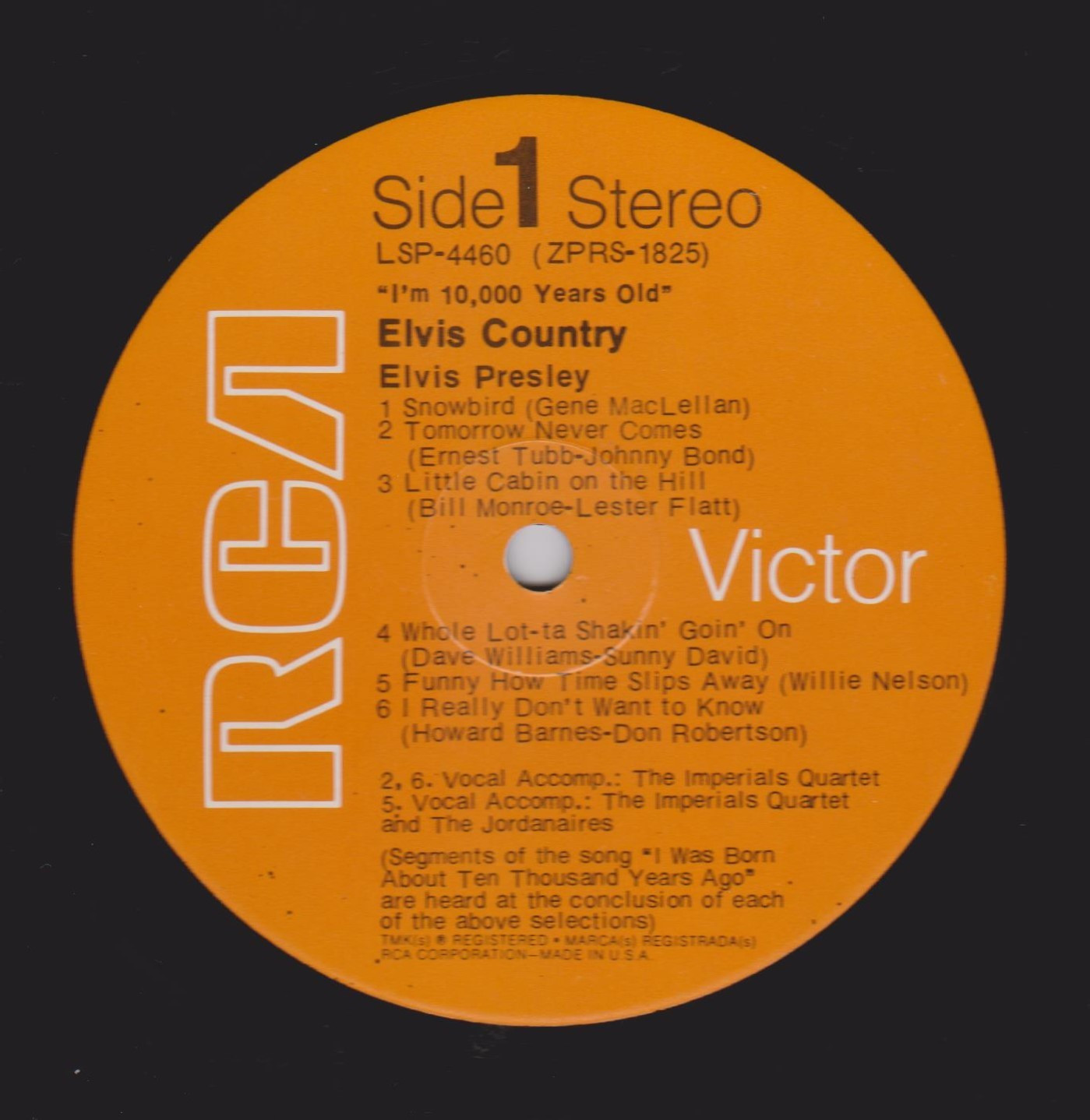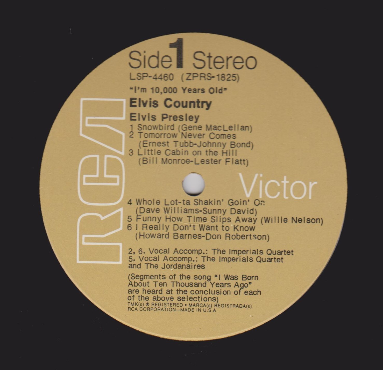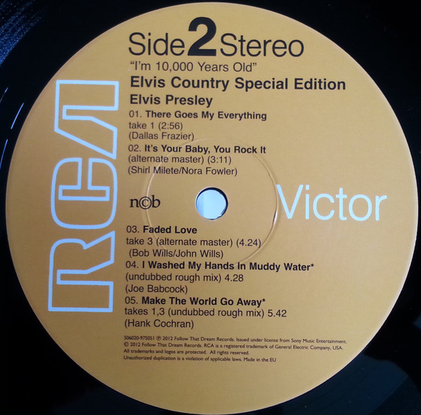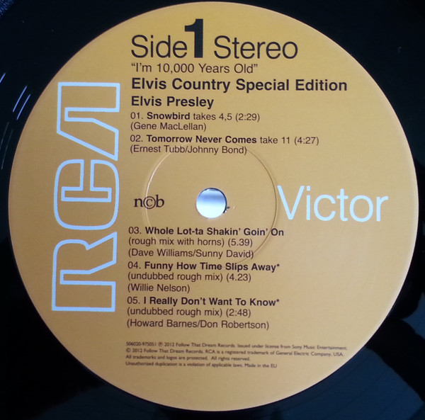 10,000 YEARS OLD, ELVIS COUNTRY (LP) (US) RCA LSP 4460 Released: January 7, 1971 Side 1 Snowbird **** Tomorrow Never Comes *** Little Cabin On The Hill * Whole Lotta Shakin' Goin' On **** Funny How Time Slips Away *** I Really Don't Want To Know Side 2 There Goes My Everything It's Your Baby, You Rock It ** Fool, The * Faded Love *** I Washed My Hands In Muddy Water *** Make The World Go Away *** * Recorded: RCA Studio B, Nashville,
