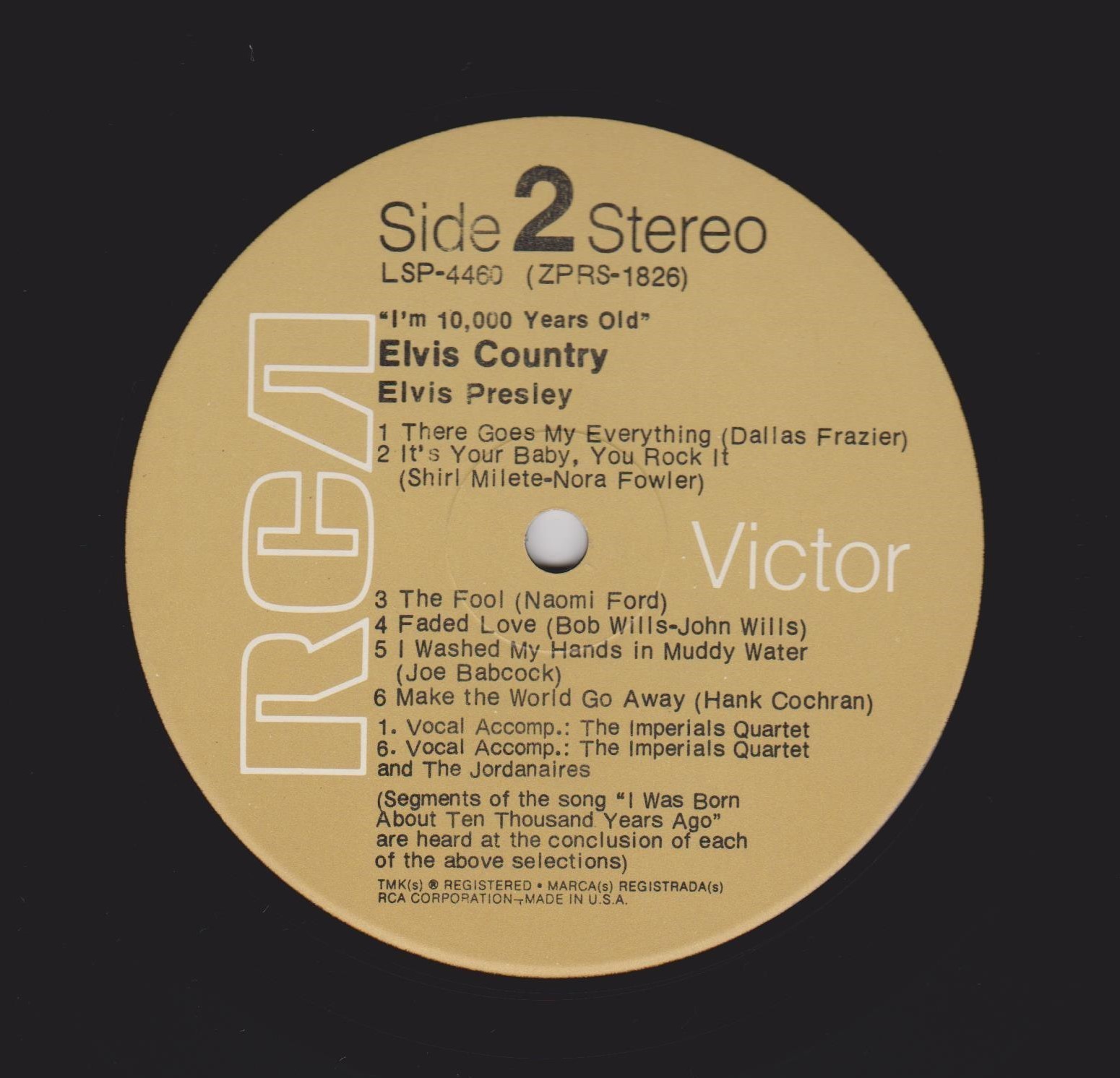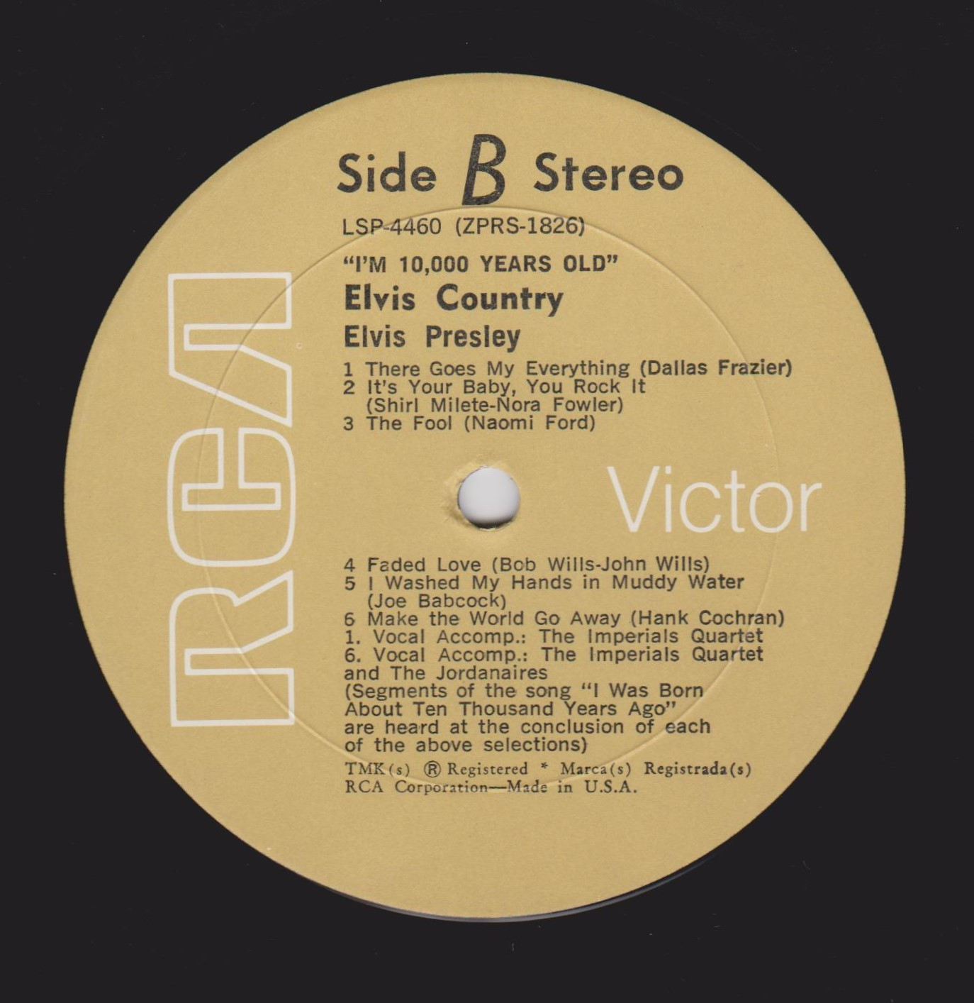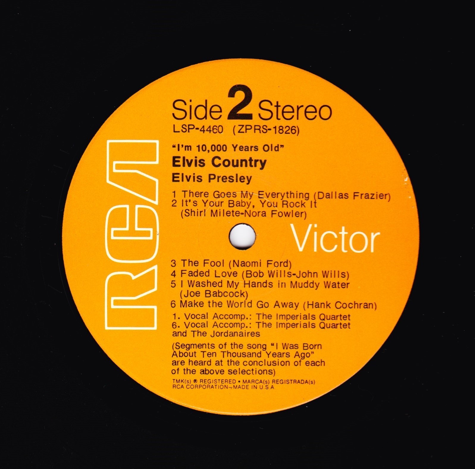 10,000 YEARS OLD, ELVIS COUNTRY (LP) (US) RCA LSP 4460 Released: January 7, 1971 Side 1 Snowbird **** Tomorrow Never Comes *** Little Cabin On The Hill * Whole Lotta Shakin' Goin' On **** Funny How Time Slips Away *** I Really Don't Want To Know Side 2 There Goes My Everything It's Your Baby, You Rock It ** Fool, The * Faded Love *** I Washed My Hands In Muddy Water *** Make The World Go Away *** * Recorded: RCA Studio B, Nashville,