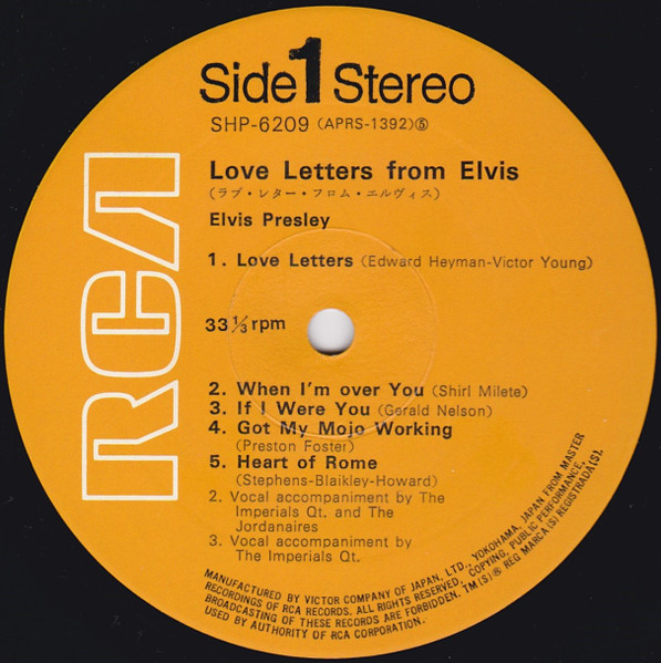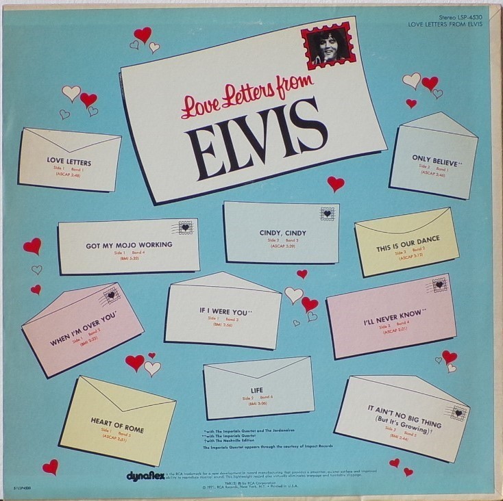 LETTERS FROM ELVIS (LP) (US) RCA LSP 4530 Released: June 1971 Side 1 Love Letters (1970) **** When I'm Over You **** If I Were You ***** Got My Mojo Working - Keep Your Hands Off Of It ** Heart Of Rome *** Side 2 Only Believe This Is Our Dance *** Cindy, Cindy * I'll Never Know *** It Ain't No Big Thing (But It's Growing) *** Life * Recorded: