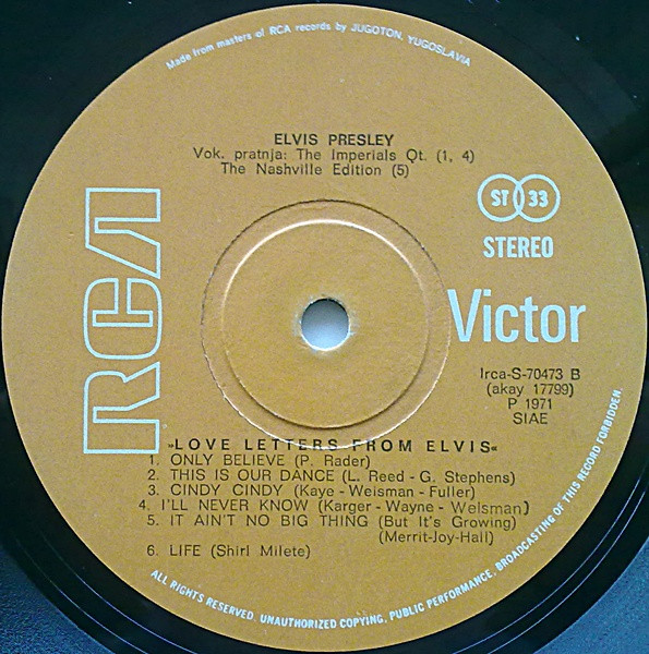 | Label: Jugoton – LSRCA-70473, RCA Victor – LSRCA-70473 Format: Vinyl, LP, Album Country: Yugoslavia Released: 1971 Made By – Jugoton. Made in Yugoslavia. Matrix / Runout (Side A Label): Irca-S-70473 A |