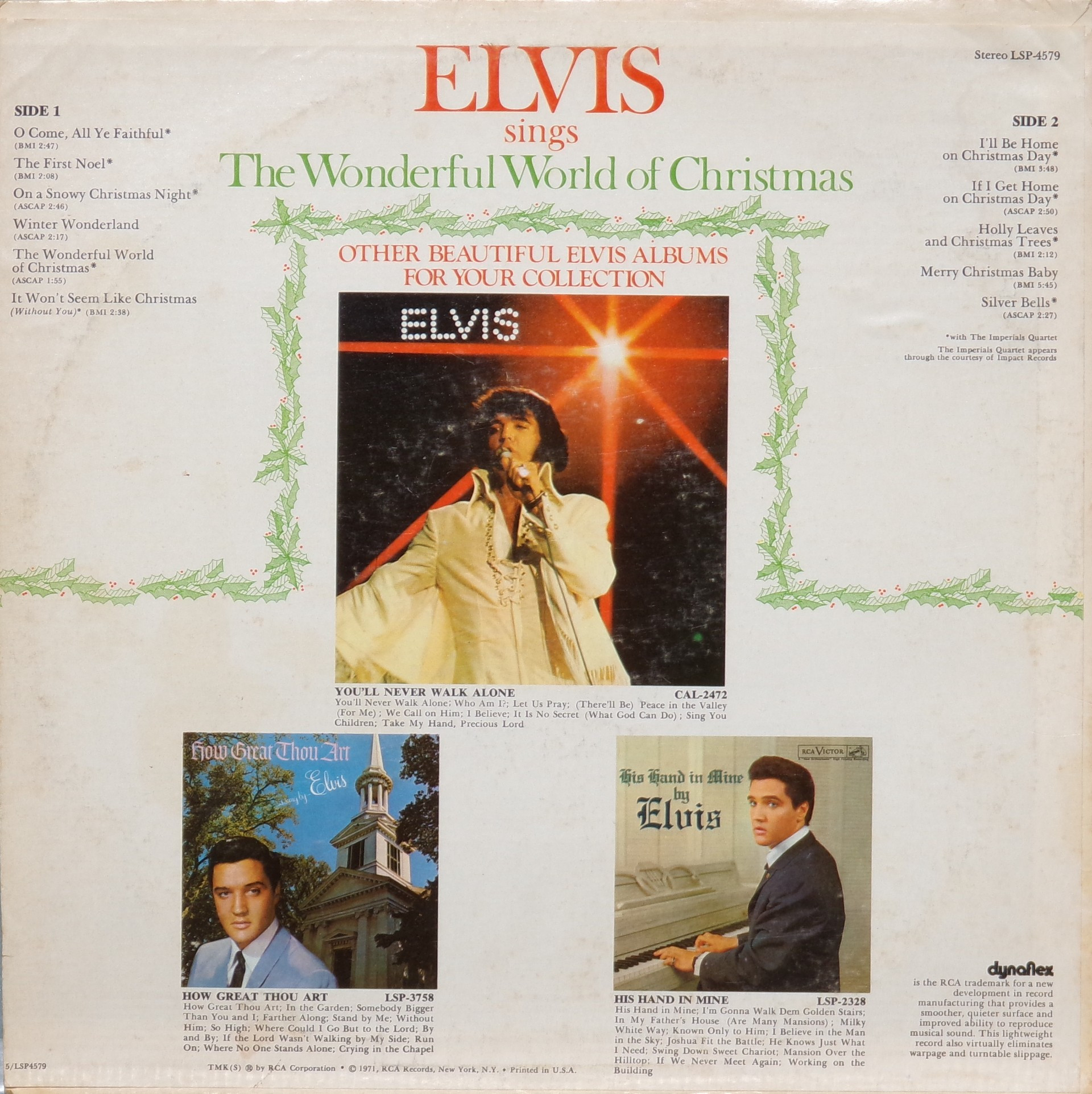 SINGS THE WONDERFUL WORLD OF CHRISTMAS (LP) (US) RCA LSP 4579 Released: September 1971 Side 1 O Come, All Ye Faithful ** First Noel ** On A Snowy Christmas Night ** Winter Wonderland ** Wonderful World Of Christmas ** It Won't Seem Like Christmas (Without You) * Side 2 I'll Be Home On Christmas Day ** If I Get Home On Christmas Day * Holly Leaves and Christmas Trees * Merry Christmas Baby * Silver Bells * * Recorded: RCA Studio B,