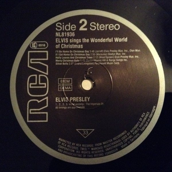 Nashville, May 15, 1971 Brief History : Elvis Sings The Wonderful World Of Christmas is a 1971 album by Elvis Presley, and Elvis' second and final Christmas album. The album was released in October 1971, followed by the single from the album "Merry Christmas Baby" / "O Come All Ye Faithful" released in November 1971. This album was a top seller and topped the Billboard Holiday Albums Chart, and would have charted high on the Billboard 200 but from 1963 to 73 Holiday albums were not allowed to chart. It did not have the commercial appeal of Elvis’ first Christmas album. Over the years, it has become a perennial favorite. It was certified Gold on 11/4/1977, Platinum on 12/1/1977, 2x Platinum on 5/20/1988 and 3x Platinum on 7/15/1999 by the RIAA. Several of the songs on the album were published by Elvis Presley's publishing company, such as "Holly Leaves And Christmas Trees", "I'll Be Home On Christmas Day", "If I Get Home On Christmas Day", and "On a Snowy Christmas Night". Orange Label Details : *NOTE* 7inch x 5inch postcard issued with this release. |