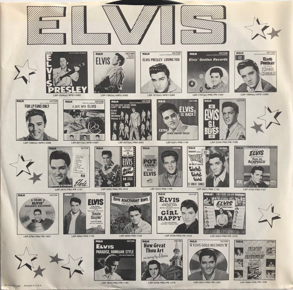 | Details : 1976 Front Cover : 3 Photos of Elvis. Title top centre. Catalogue number bottom right. Rear Cover : Catalogue number top right. Printed in U.S.A. bottom centre. Label : Tan. Dynaflex vinyl. Side 1 : Stereo at top. Side 2 : Stereo at top. Pressing Plant : Indianapolis Matrix Number Side 1 : APRS - 1392 - 31S A1 (Machine Stamped) W (Hand Etched) Matrix Number Side 2 : APRS - 1393 - 32S A1 (Machine Stamped) L (Hand Etched) *Note* Title on 3 lines. "RE" bottom left front cover. |