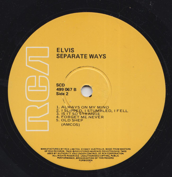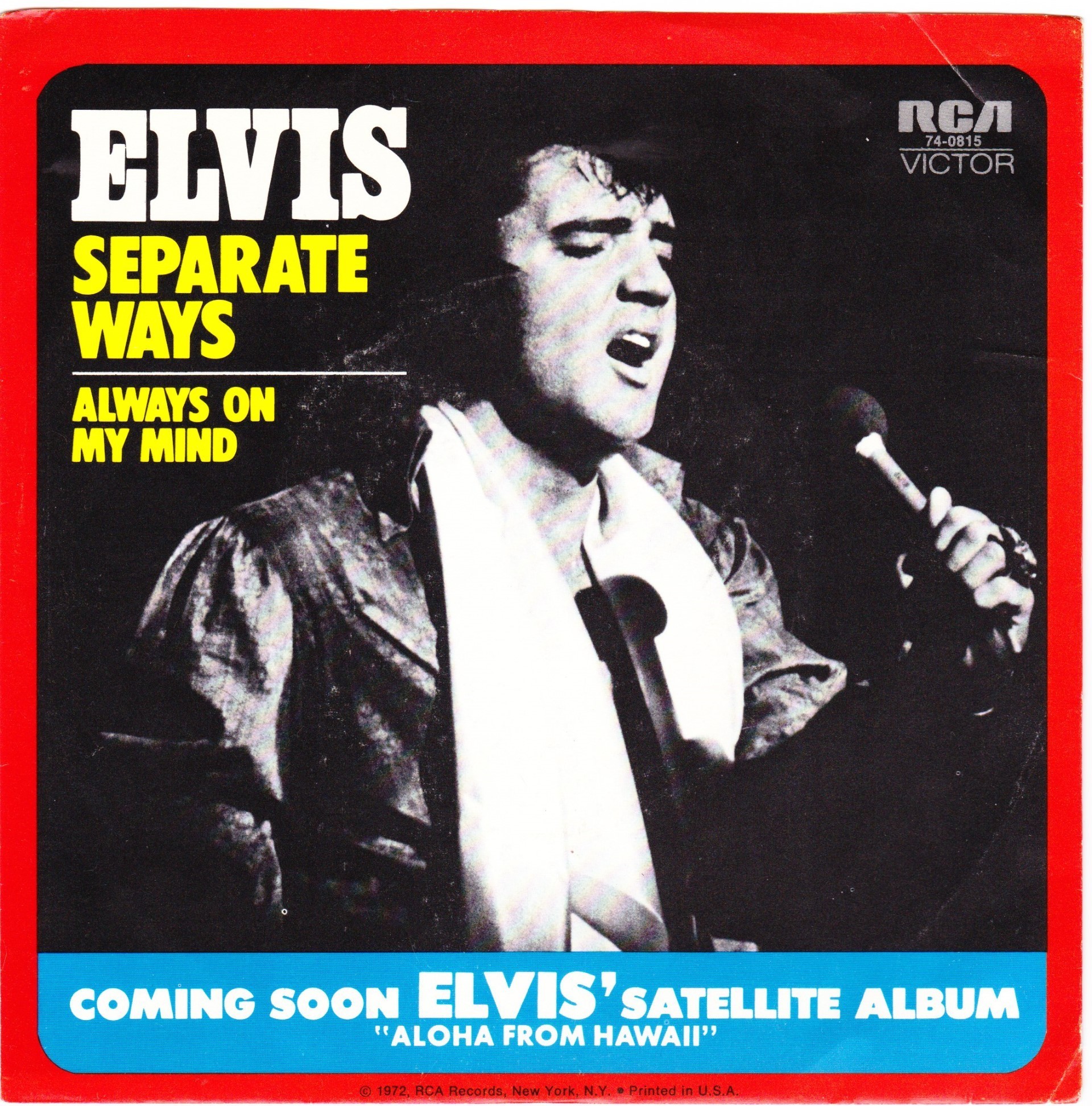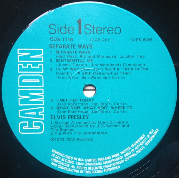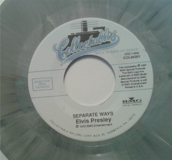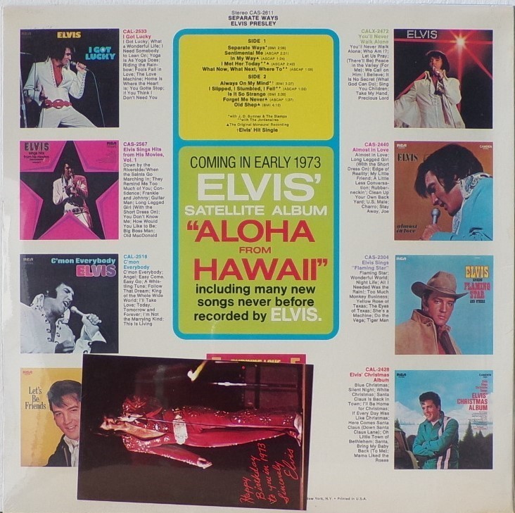 (LP) Brief History : Separate Ways is a compilation album by Elvis Presley from 1972. Released by RCA Records under its RCA-Camden subsidiary exactly one month after another compilation, Burning Love and Hits from His Movies, Volume 2, Separate Ways was the second and final attempt by RCA to repackage older Elvis recordings by pairing them with a recent hit single, in this case "Separate Ways" and its flipside "Always On My Mind". The remainder of the album -- which was not promoted as a compilation on the front cover -- consisted of a mixture of previously released recordings from Presley film soundtracks of the 1960s, plus one song, "Old Shep", dating back to 1956. The album was reissued by Pickwick/Camden utilizing the original catalogue number CAS-2611. The only apparent difference is the cover indicates Pickwick at the bottom center front, where as the original issue indicated RCA. The contents of the re-issue are exactly the same as the original issue. It just missed the top 10 of the Billboard charts on its release and has since gone on to sell over 3 million copies world-wide. It was certified Gold on 3/27/1992 and Platinum on 1/6/2004 by the RIAA. Front Cover : Photo of Elvis. Title top right. Catalogue number bottom