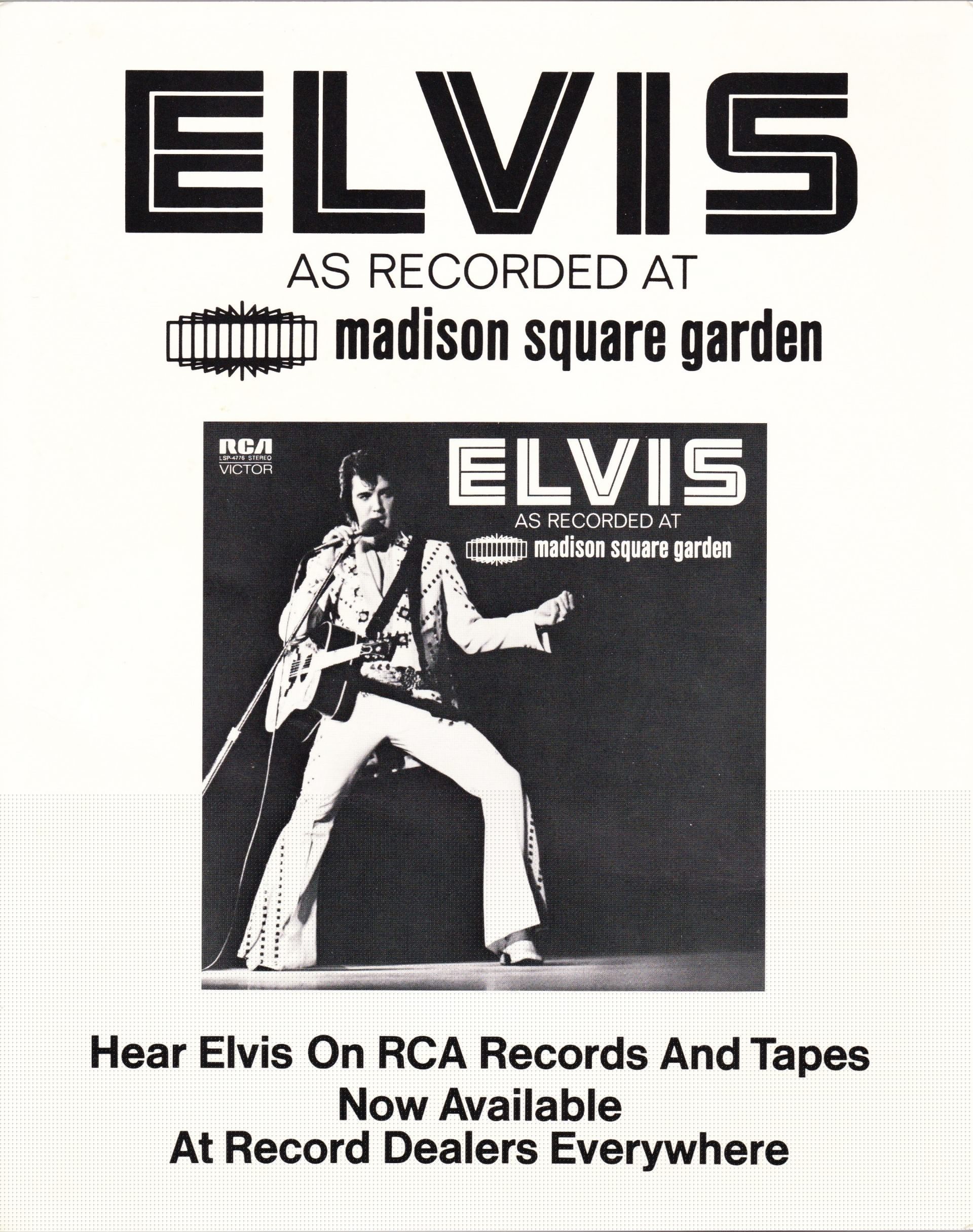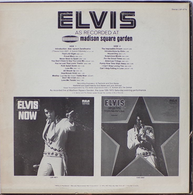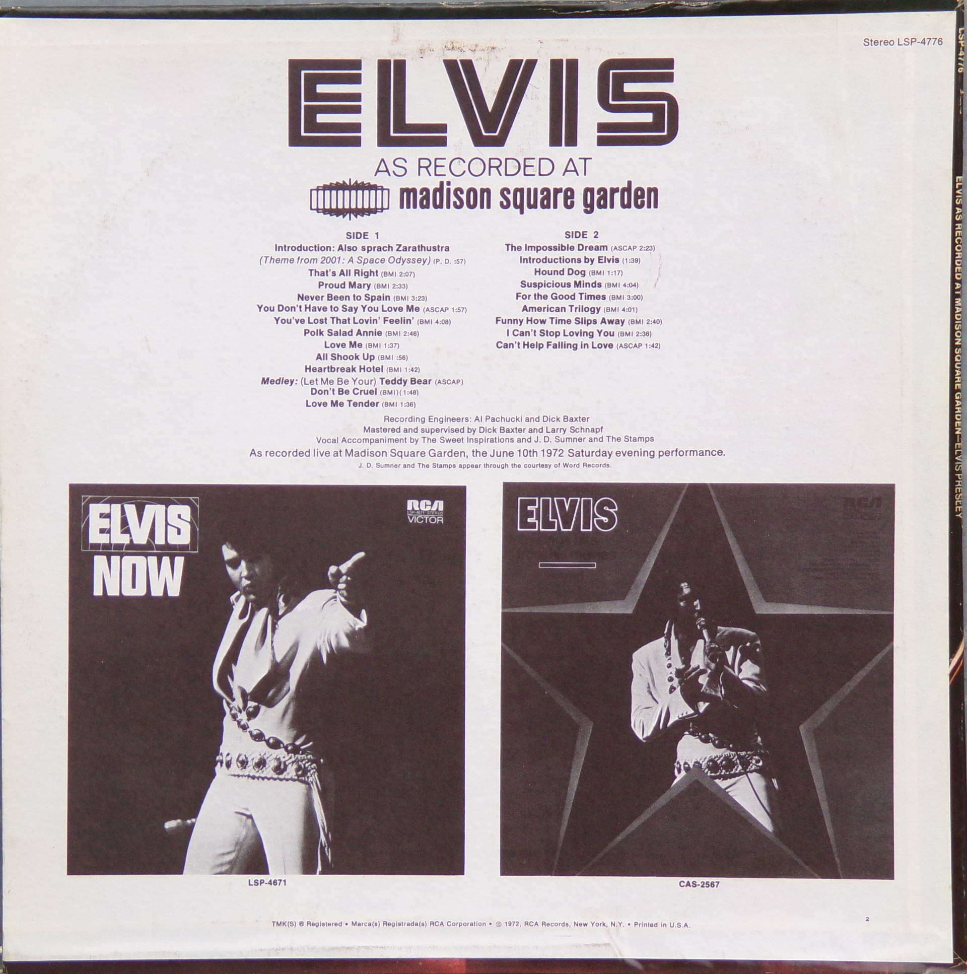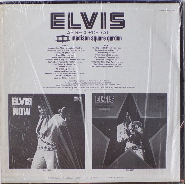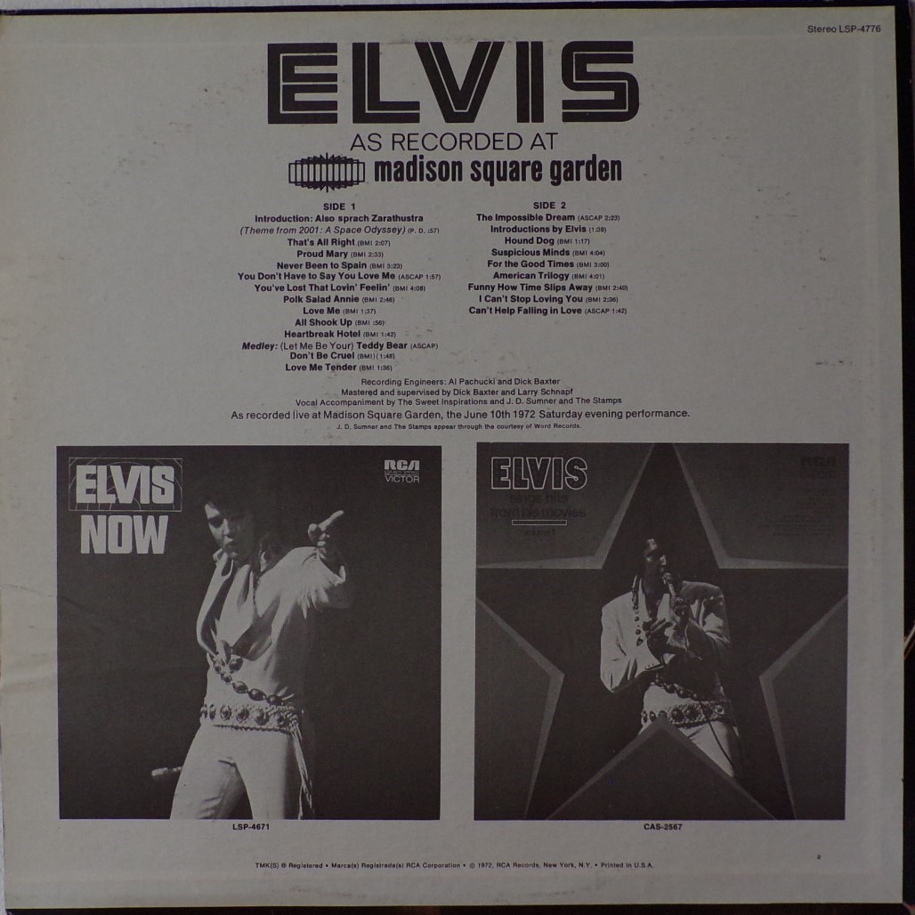 Square Garden, New York City, Brief History : Elvis: As Recorded at Madison Square Garden is a live musical album recorded by Elvis Presley and released in June 1972 by RCA Records peaking on the charts in July 1972. Recorded at the Madison Square Garden arena in New York City on Saturday June 10, 1972, the concert, and the subsequent album, were promoted as being Presley's first live concerts in the Big Apple since the 1950s. It was certified Gold on 8/4/1972, Platinum on 5/20/1988, 2x Platinum on 3/27/1992 and 3x Platinum on 7/15/1999 by the RIAA. Despite the lengthy track listing, the release was only a single disc, and the record was released only a week after the concert itself. Elvis' very next album would also be a live recording featuring many of the same songs: Aloha from Hawaii: Via Satellite. The concert included on this album was the evening show. An afternoon performance was also recorded, but except for a performance of "I Can't Stop Loving You" which appeared in the 1977 compilation, Welcome to My World, it remained unreleased until the 1990s when it was issued as An Afternoon in the Garden. Drummer Ronnie Tutt claimed in an interview in 2009 for the BBC documentary Elvis in Vegas that Colonel Tom Parker sped up the mixes so that more tracks could be on the album, increasing his publishing royalties. Tutt's account has never been proven as factual. Front Cover : Photo of Elvis. Title top right. Catalogue number top