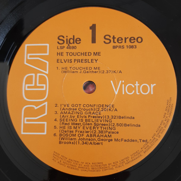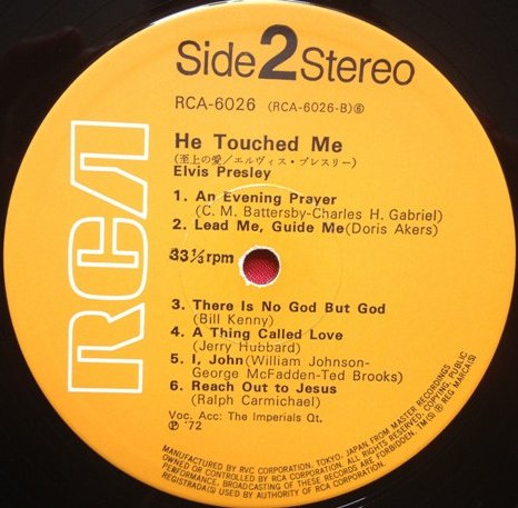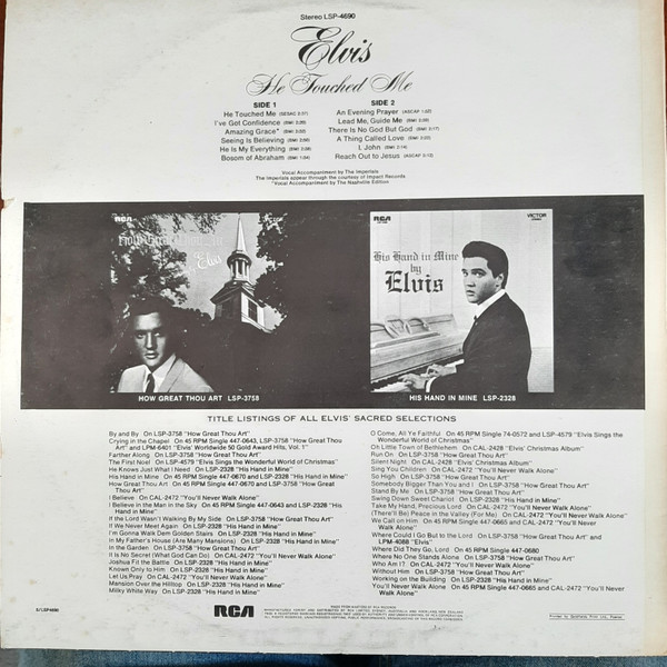 TOUCHED ME (LP) (US) RCA LSP 4690 Released: April 1972 Side 1 He Touched Me I've Got Confidence *** Amazing Grace * Seeing Is Believing **** He Is My Everything ****** Bosom Of Abraham Side 2 Evening Prayer *** Lead Me, Guide Me ** There Is No God But God ****** Thing Called Love **** I, John ****** Reach Out To Jesus ***** *