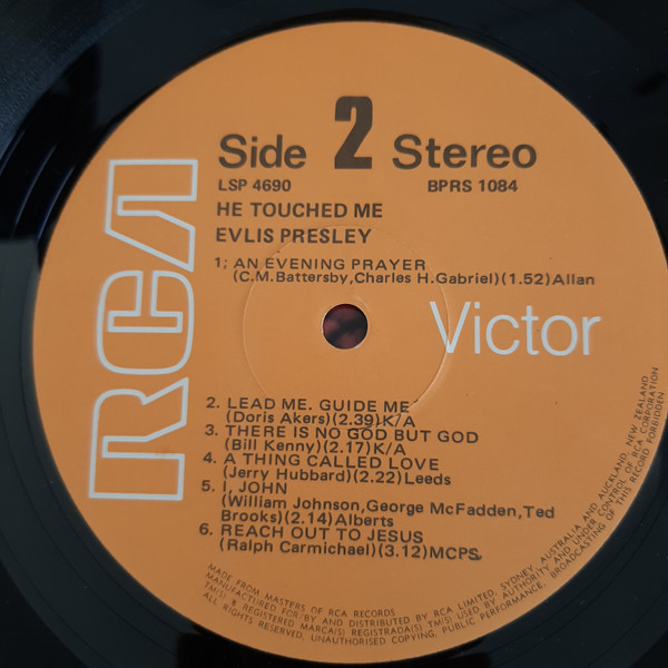 left. Rear Cover : Promoting 2 Elvis albums. Catalogue number top right. Printed in U.S.A. bottom. Label : Orange. Dynaflex vinyl. Side 1 : Stereo at top. Side 2 : Stereo at top. Pressing Plant : Rockaway (Hand Etched) Matrix Number Side 1 : BPRS - 5144 - 5S AID (Hand Etched) Matrix Number Side 2 : BPRS - 5145 - 5S BID (Machine Stamped) *NOTE* Rear cover number "2" bottom right. |