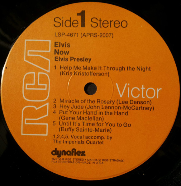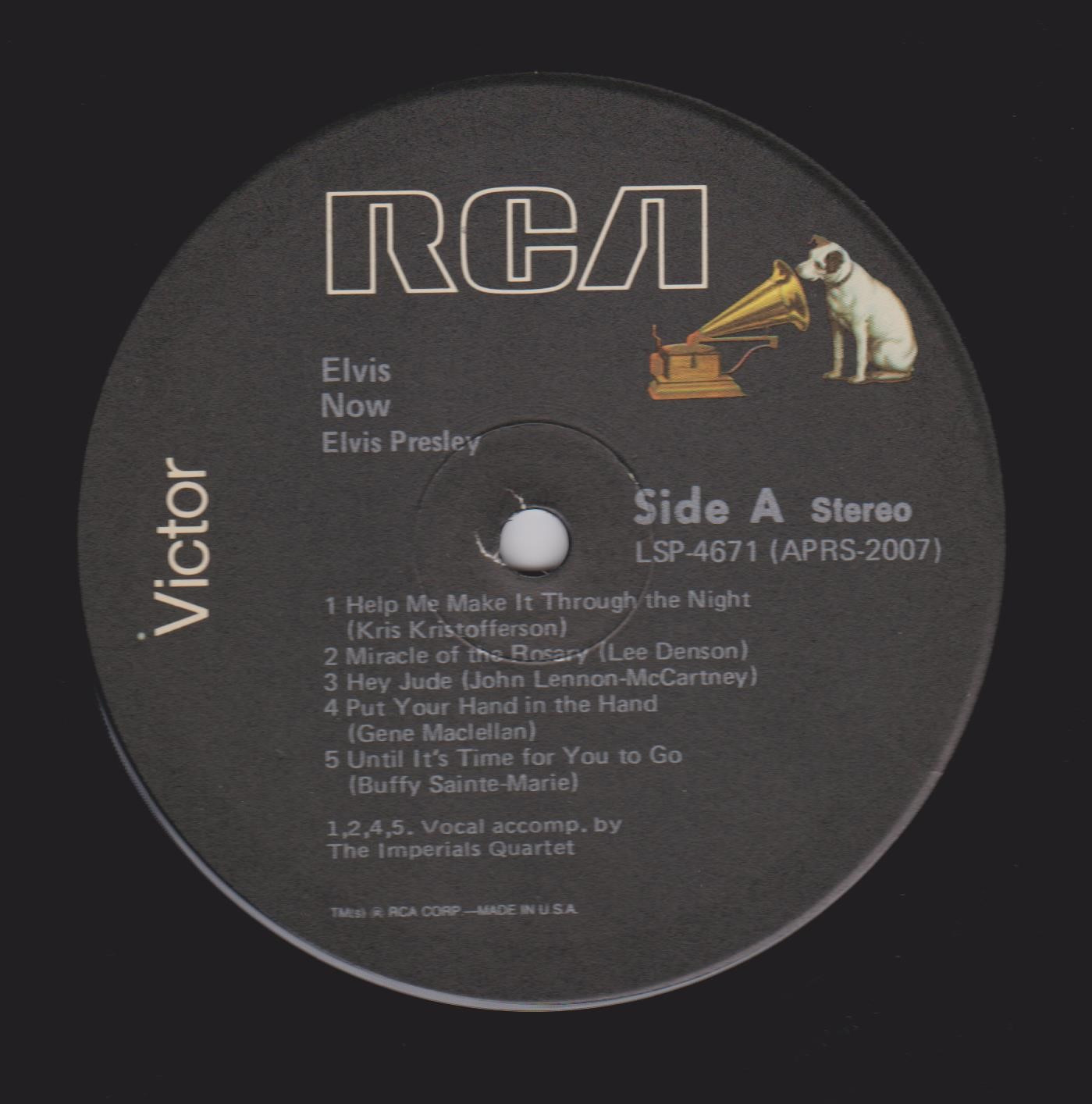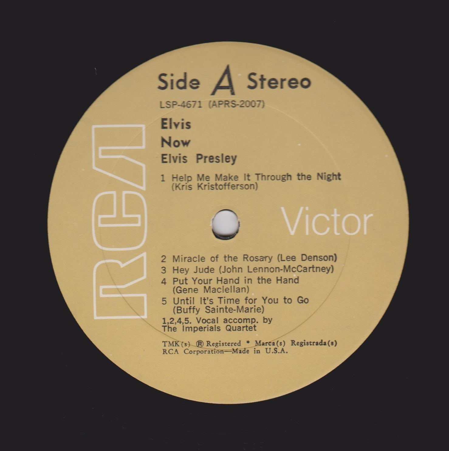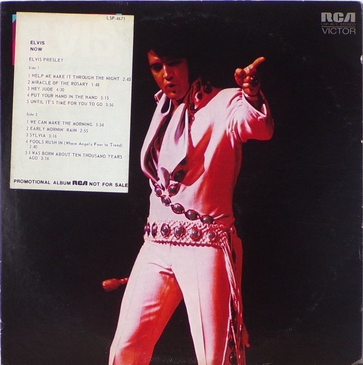 NOW (LP) (US) RCA LSP 4671 Released: February 1972 Side 1 Help Me Make It Through The Night ****** Miracle Of The Rosary ***** Hey Jude * Put Your Hand In The Hand ********* Until It's Time For You To Go ****** Side 2 We Can Make The Morning ******** Early Mornin' Rain **** Sylvia *** Fools Rush In (Where Angels Fear To Tread) ******* I Was Born About Ten Thousand Years Ago ** * Recorded: American Studios, Memphis, January