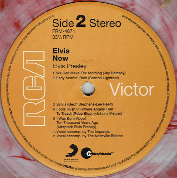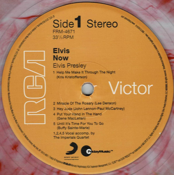 Group – 88875104241, RCA Victor – FRM-4671, RCA Victor – 88875104241 Format: Vinyl, LP, Album, Limited Edition, Reissue, Stereo, 180g Gatefold Red/Gold Swirl Country: US Released: Mar 2019 Mastered At – Battery Studios, New York Mastered By – Vic Anesini Friday Music reissue, available in two formats, this copy has Red & Gold swirled vinyl. This was also released by Friday Music in a Black & Blue swirled vinyl version: Elvis Now Cat number FRM-4671 is shown on front artwork, and cat number 88875104241 appears on the rear artwork. Includes a 24x24 full color poster of album cover Barcode (Text): 8 29421 46710 6 |