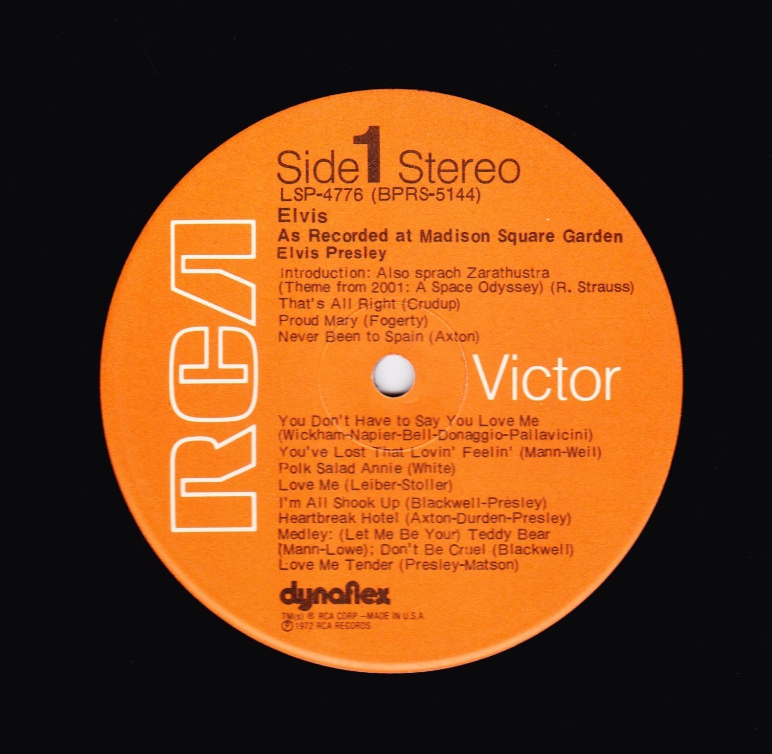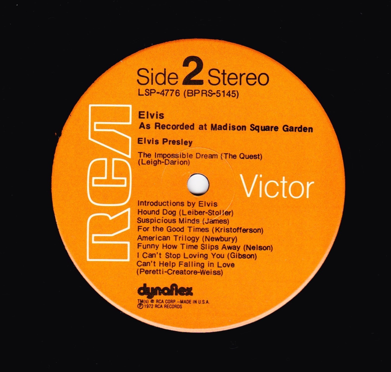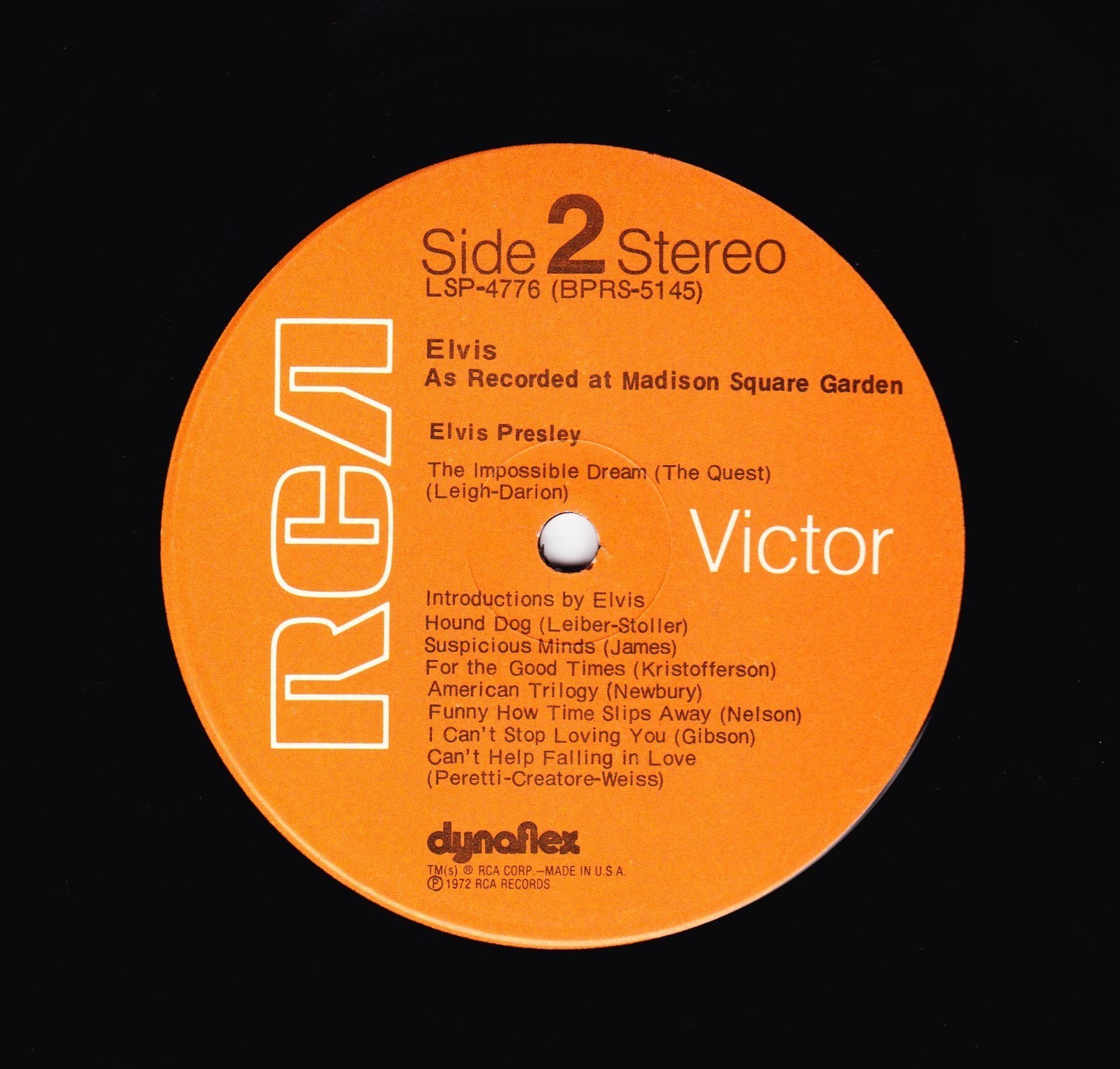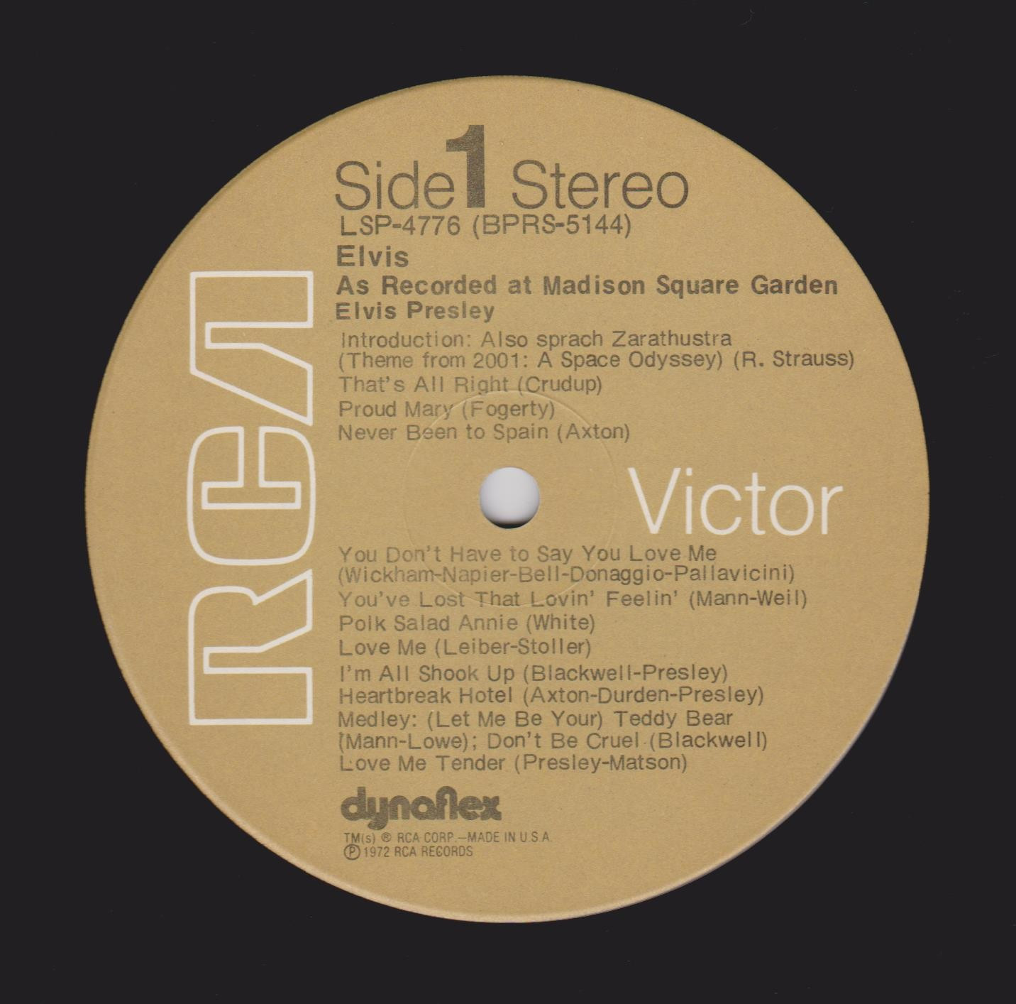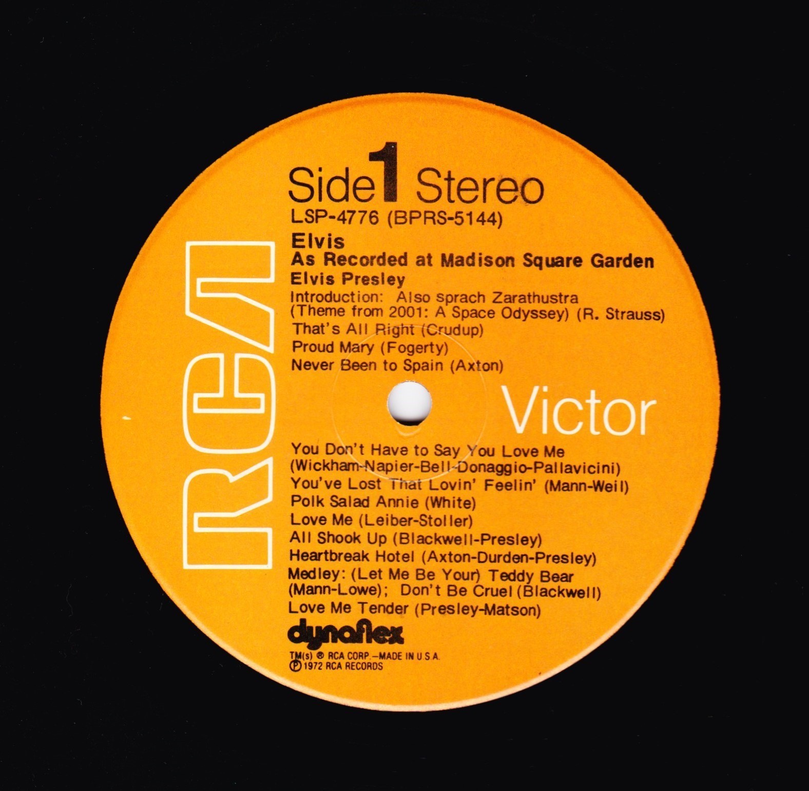 AS RECORDED AT MADISON SQUARE GARDEN (LP) (US) RCA LSP 4776 Released: June 1972 Side 1 Introduction: Also Sprach Zarathustra * That's All Right * Proud Mary * Never Been To Spain * You Don't Have To Say You Love Me * You've Lost That Lovin' Feelin' * Polk Salad Annie * Love Me * All Shook Up * Heartbreak Hotel * Teddy Bear / Don't Be Cruel * Love Me Tender * Side 2 Impossible Dream * Introduction By Elvis * Hound Dog * Suspicious Minds * For The Good Times * American Trilogy * Funny How Time Slips Away * I Can't Stop Loving You * Can't Help Falling In Love * End Theme * * Recorded: Madison